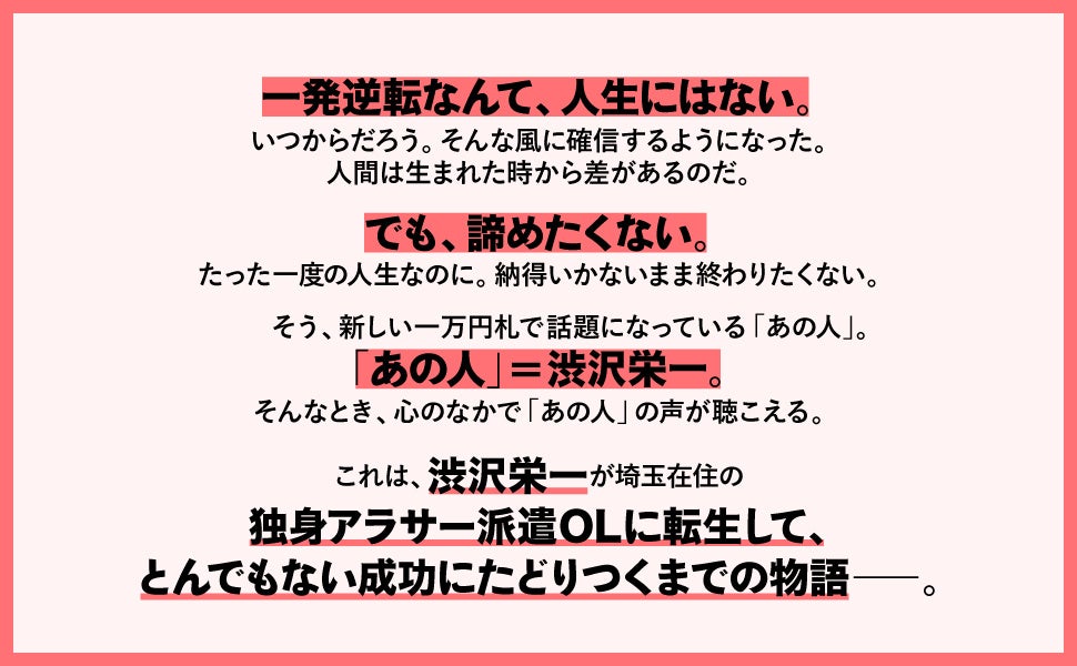 ラノベ感覚で読めるビジネス書! 現代のアラサー派遣社員の体に渋沢栄一が転生し、彼女の人生が一転する様がとても痛快でした。シンデレラストーリーのようでありながらも、しっかりとビジネスの基礎を押さえて進んでいく展開は勉強にもなります。(20代・会社員)
