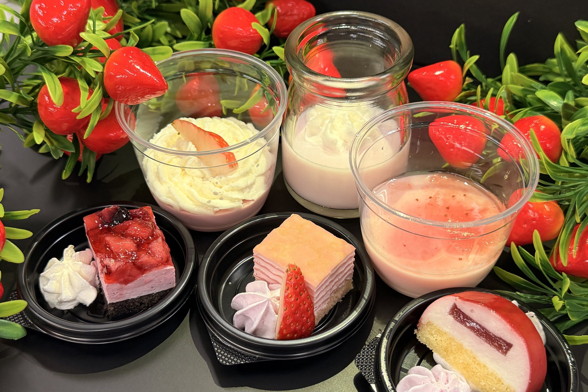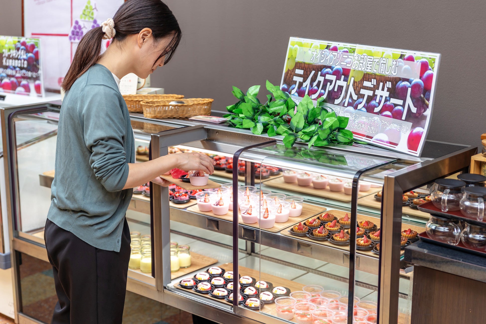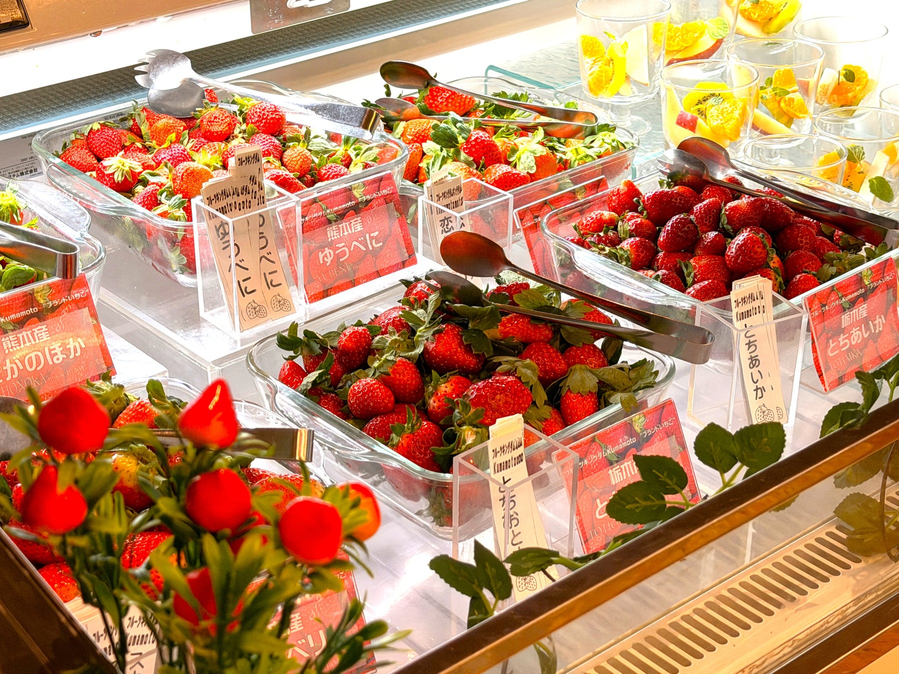 夕食ビュッフェでは、熊本産を中心とした全6種類のブランドいちごを食べ比べで楽しめます。また、いちごスイーツのテイクアウトも用意しており、レストランでも客室でも、旬のいちごを味わえます。
