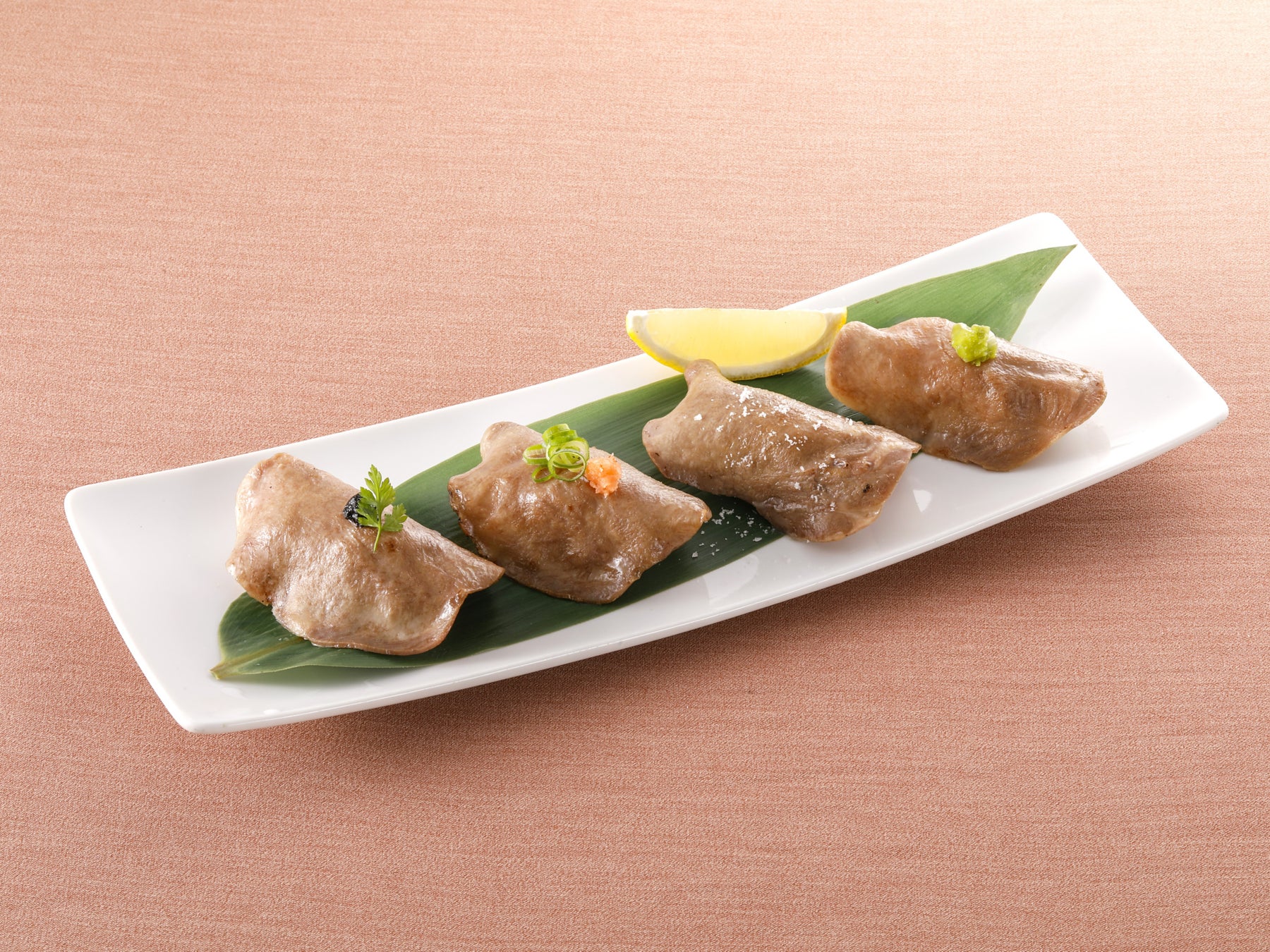 厳選した牛たんをぜいたくに使用した、人気の一皿。香ばしく炙った牛たんを中心に、味わいの違いを楽しめる4種類のにぎりを盛り合わせました。それぞれのトッピングが引き立てる、牛たんの旨味と香りのハーモニーをご堪能ください。