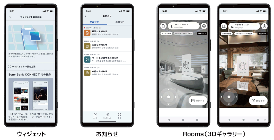 Rooms(3Dギャラリー):保有するNFTコレクションを自由に配置した、あなただけの特別な3DギャラリーをSNFTから参照して鑑賞することができます。