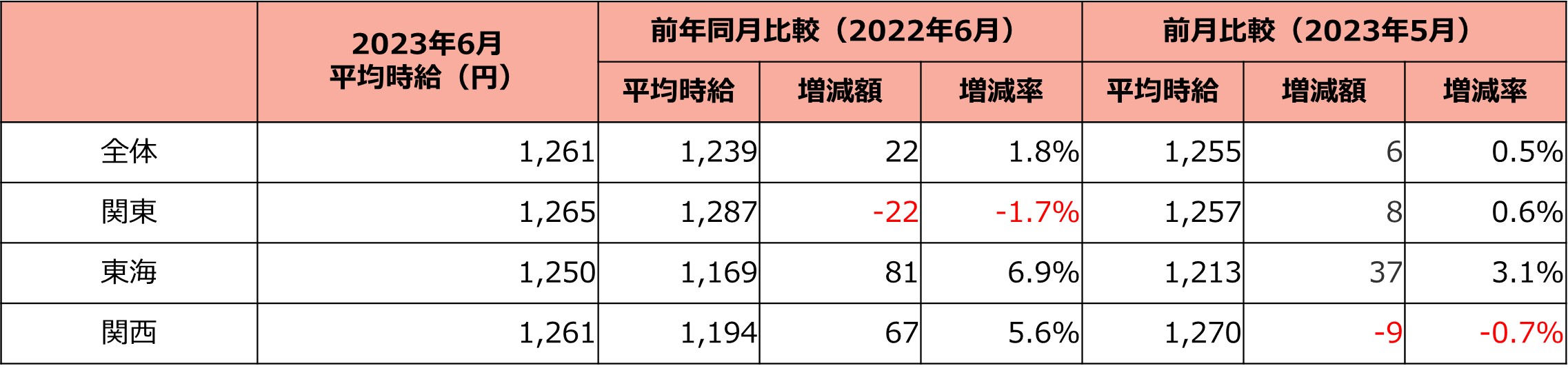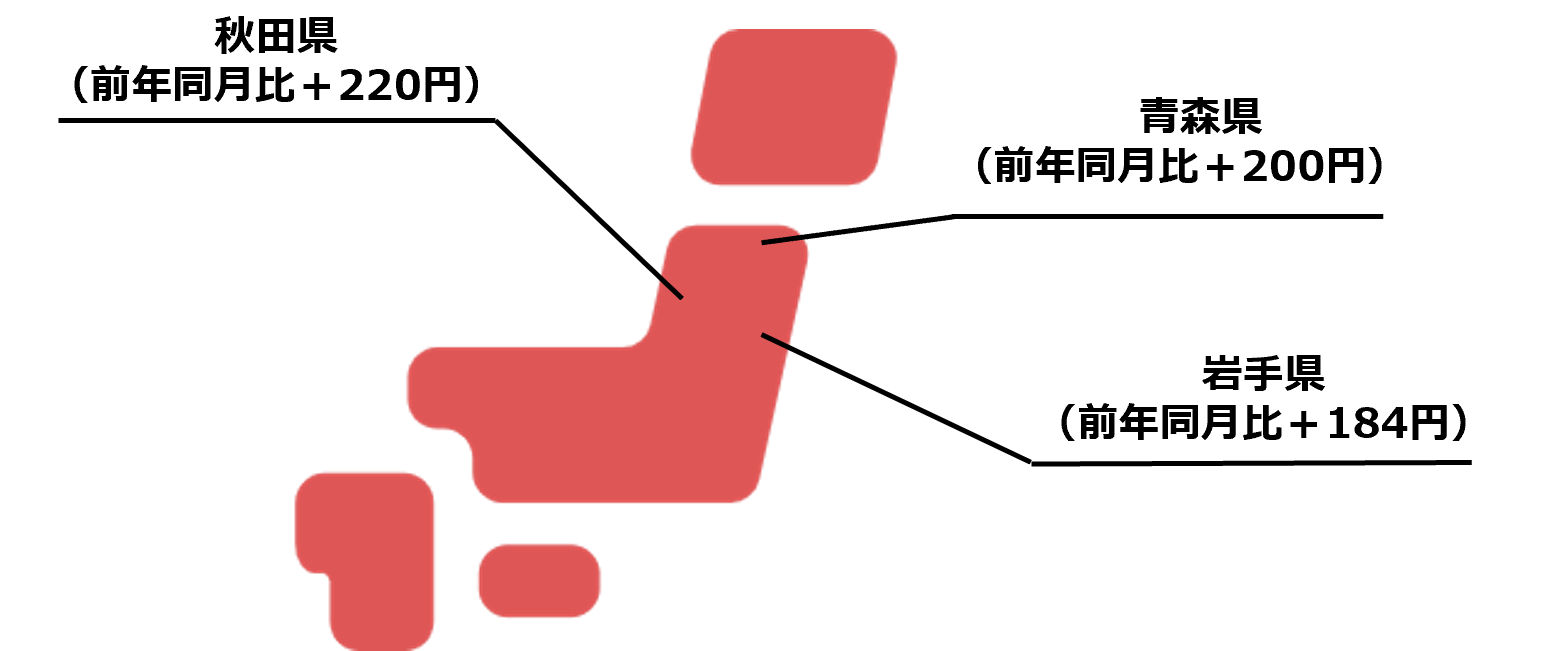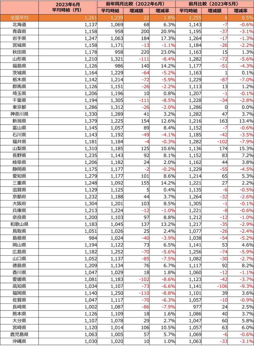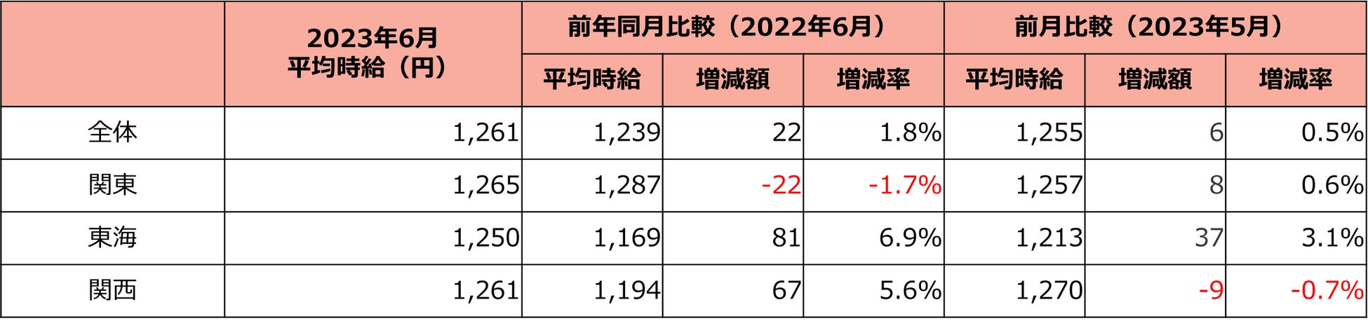 全国の6月度平均時給は1,261円で前年同月比22円アップ。 時給上昇額トップ3は東北エリア3県。