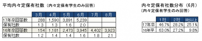 選考活動の解禁月となる6月末時点の内々定率は、前年同月比21.1pt増の65.3%で、前年の選考活動解禁月となる8月末の69.1%に迫る結果となった。特に理系院生は79.6%で、前月の46.3%から急激に増加し8割近い内々定率となっている。平均内々定保有社数は2.0社、複数内々定を獲得している学生の割合は53.3%と、内々定率と同様に、前年8月と近い結果に(前年8月の平均内々定率保有社数:2.1社、複数内々定保有学生の割合:54.7%)。