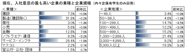 内々定保有学生に現時点で入社意思の最も高い企業の業種を尋ねたところ、「金融」が前月比5.8pt増の12.8%となり、選考解禁月に内々定を獲得する学生が増加した。企業規模別では、「1,000人以上」の合計が49.9%で、前年8月の47.3%を既に上回っている。