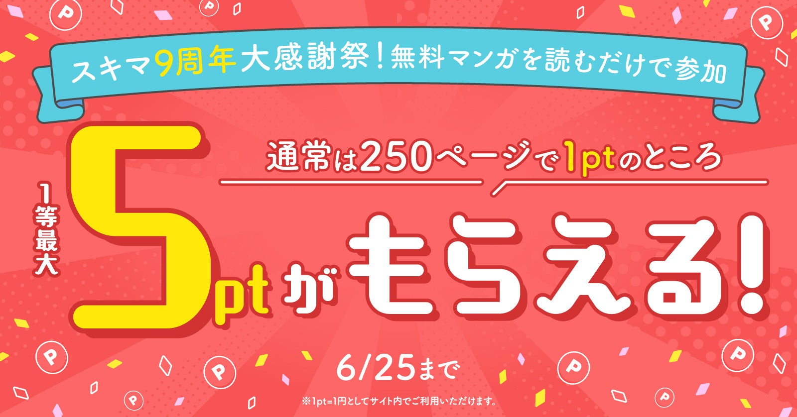 通常は漫画を250ページ読むごとに1ポイントを贈呈していますが、キャンペーン期間中は250ページ読むごとに、最大5ポイントが当たるハズレ無しの抽選に参加できます。