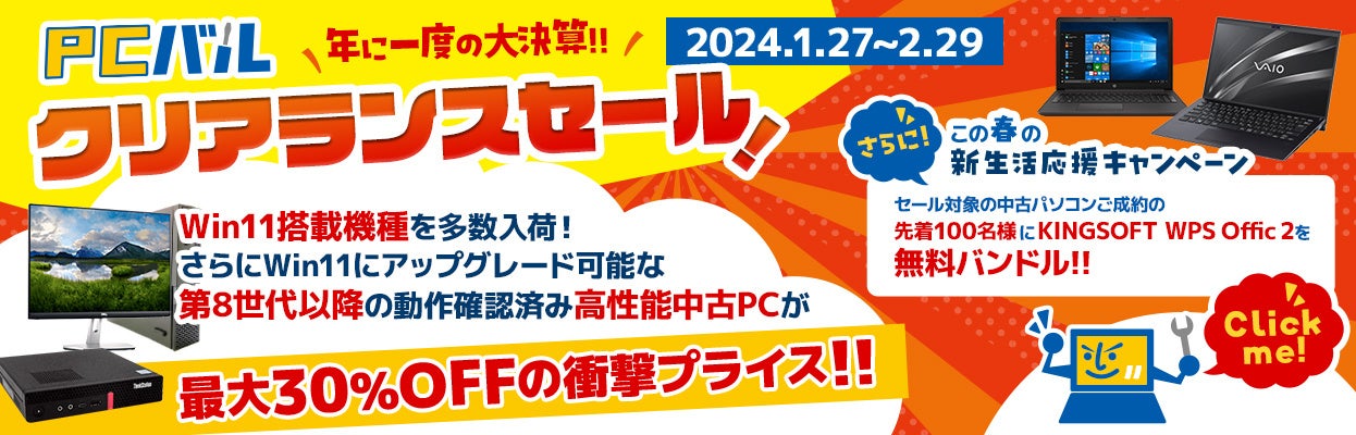 中古パソコン販売の「PCバル」、クリアランスセールを開催!Win11搭載機種など、高性能中古PCを最大30%OFFでご提供!さらに先着100名様にWPS Office2を無料でお付けします!