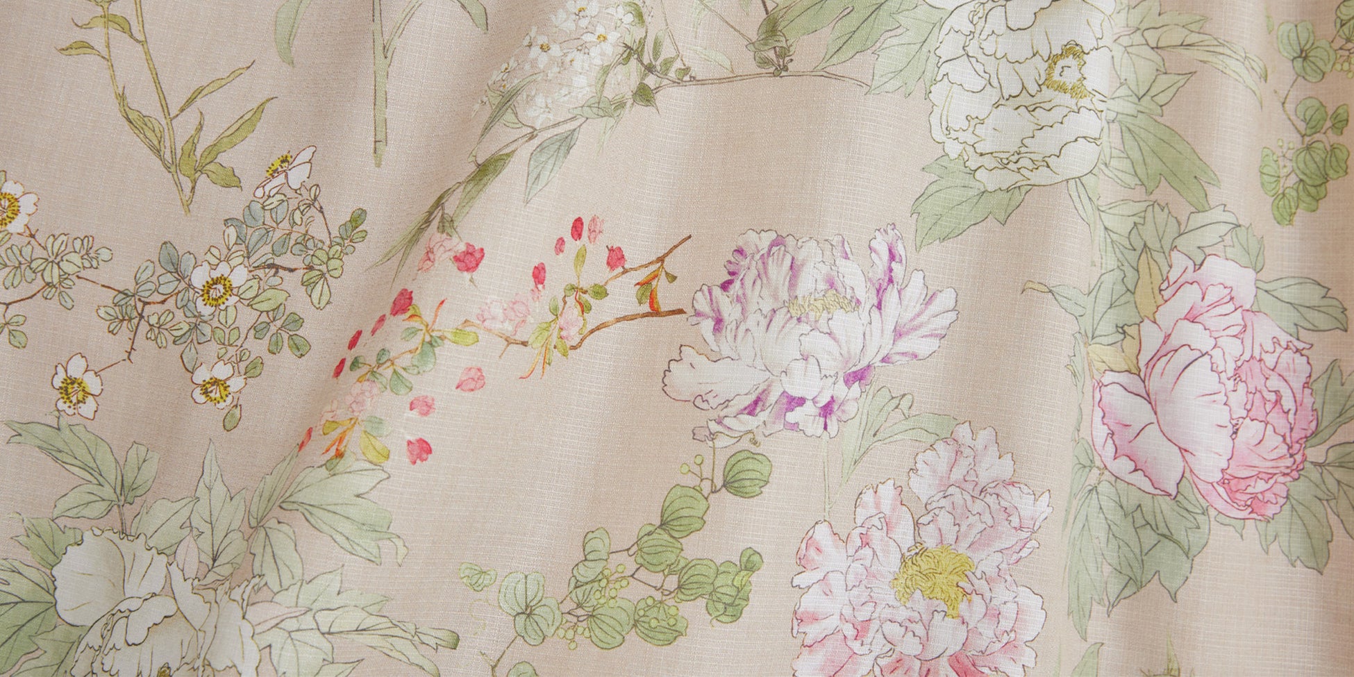 コラボレートした商品に用いた花柄は、明治期に榛原の美術顧問を務めていた、伊藤綾春(いとうりょうしゅん)の画帖に残されたスケッチを復刻したもの。