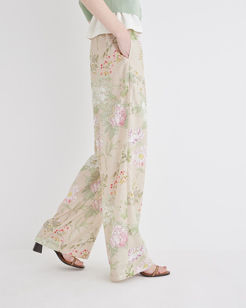 上品な光沢のある柔らかな素材のタックワイドパンツ。榛原コラボならではの繊細なタッチの柄によって、主張控えめに品よく存在感を発揮。総柄でも気負いなく日常使いできるデザインです。ややハイウエスト気味に設定し、腰回りはすっきり。シルエットにメリハリを付け、エレガントなパンツデザインに仕上げました。