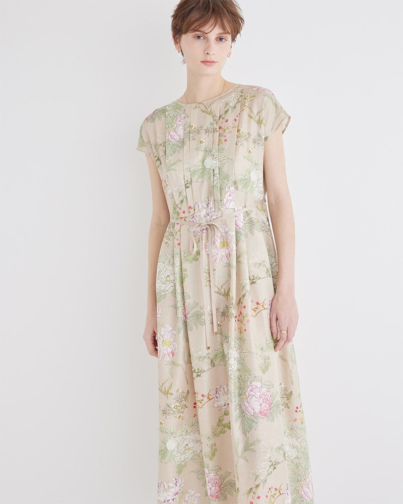 プリントは、いくつもの花々が軽やかに舞う、心地よい空気感のなかにほんのりノスタルジックなムードを宿した上品な花柄。総柄でも優しく、袖を通すたび、ほがらかな気分にさせてくれます。柄の華やかさに加え、上身頃にはタックをあしらい、さらに豊かな表情をプラス。ふっくらと光沢のある素材は、ほんのり透け感があり着心地も軽やかです。