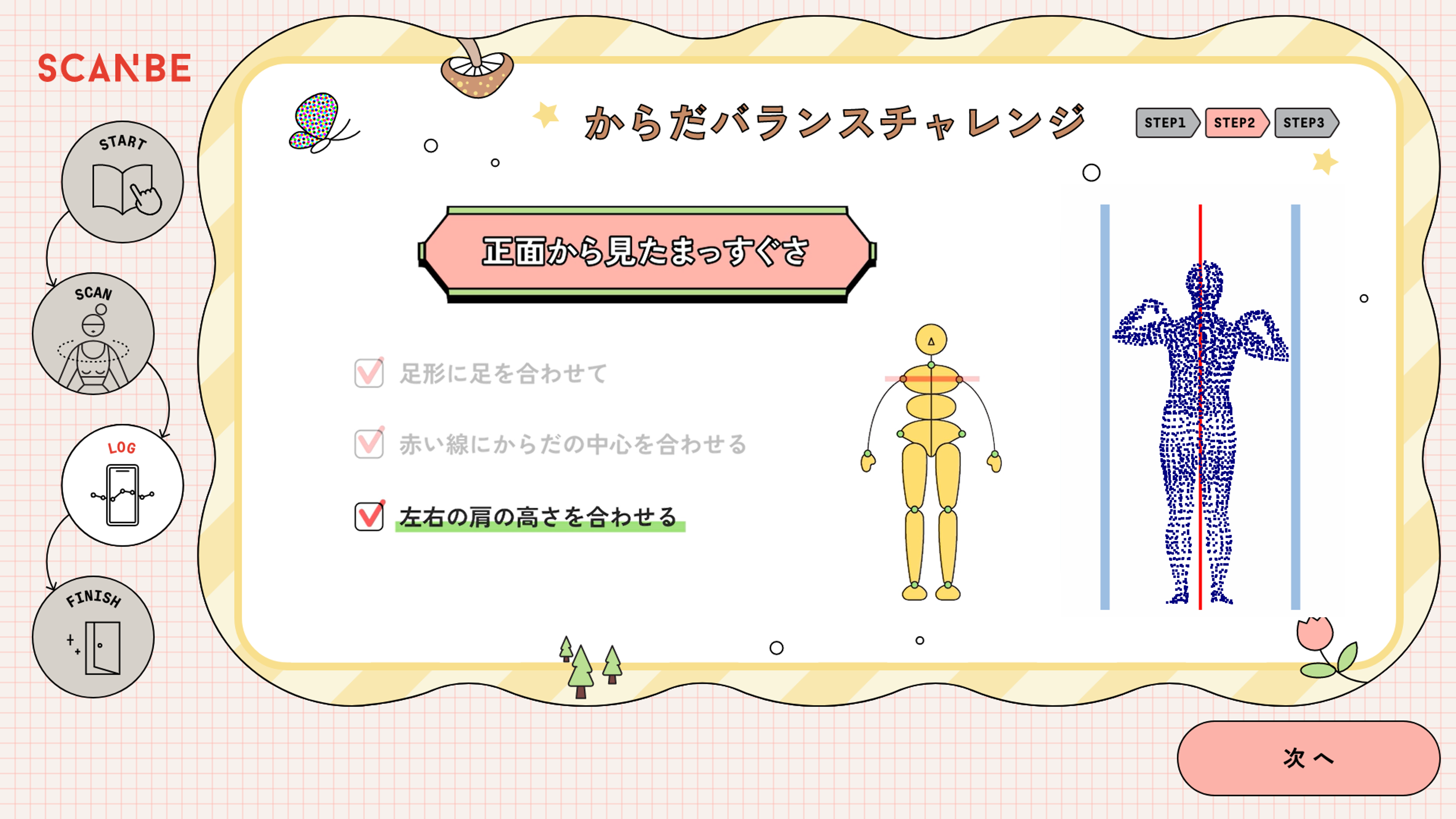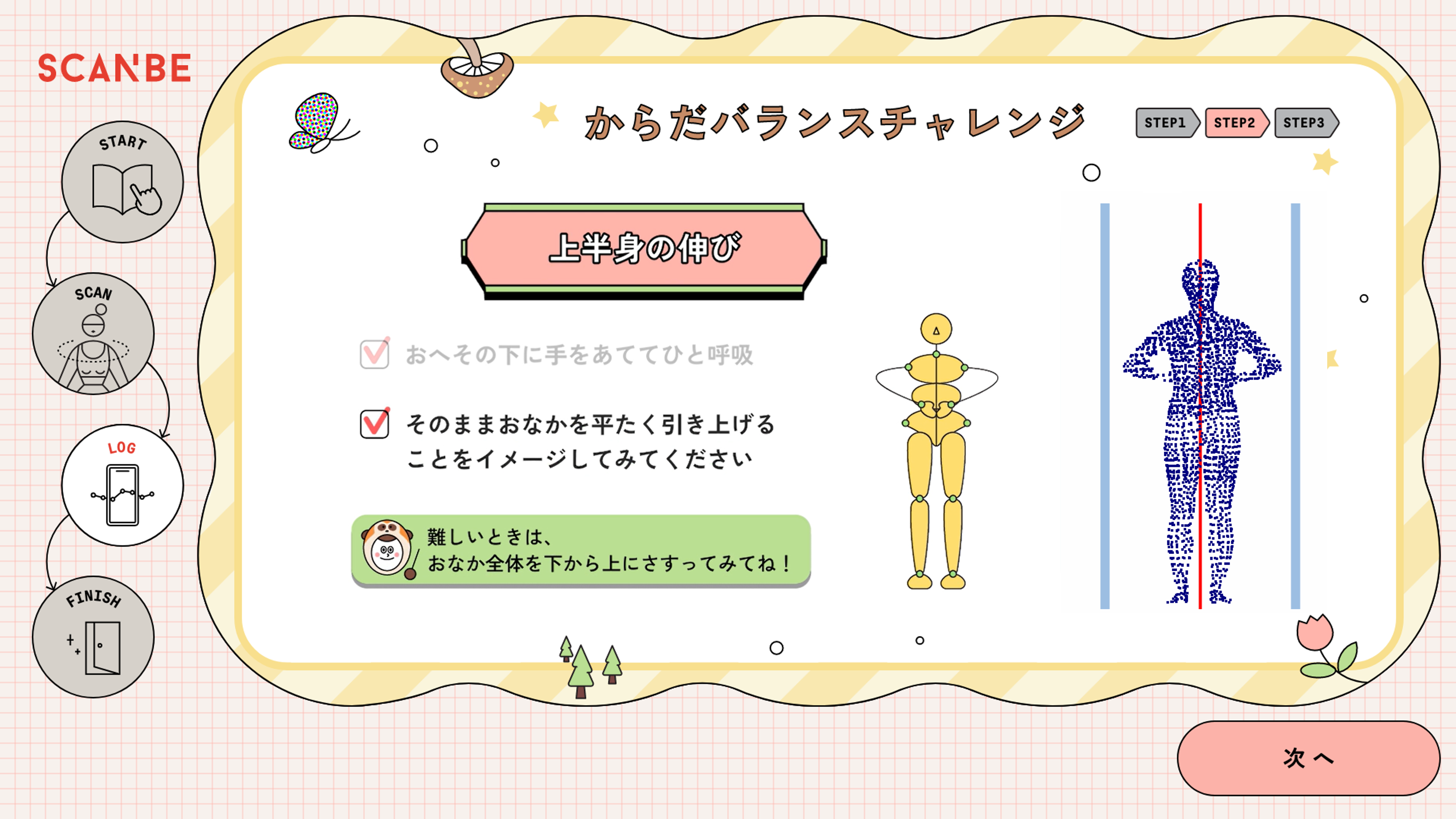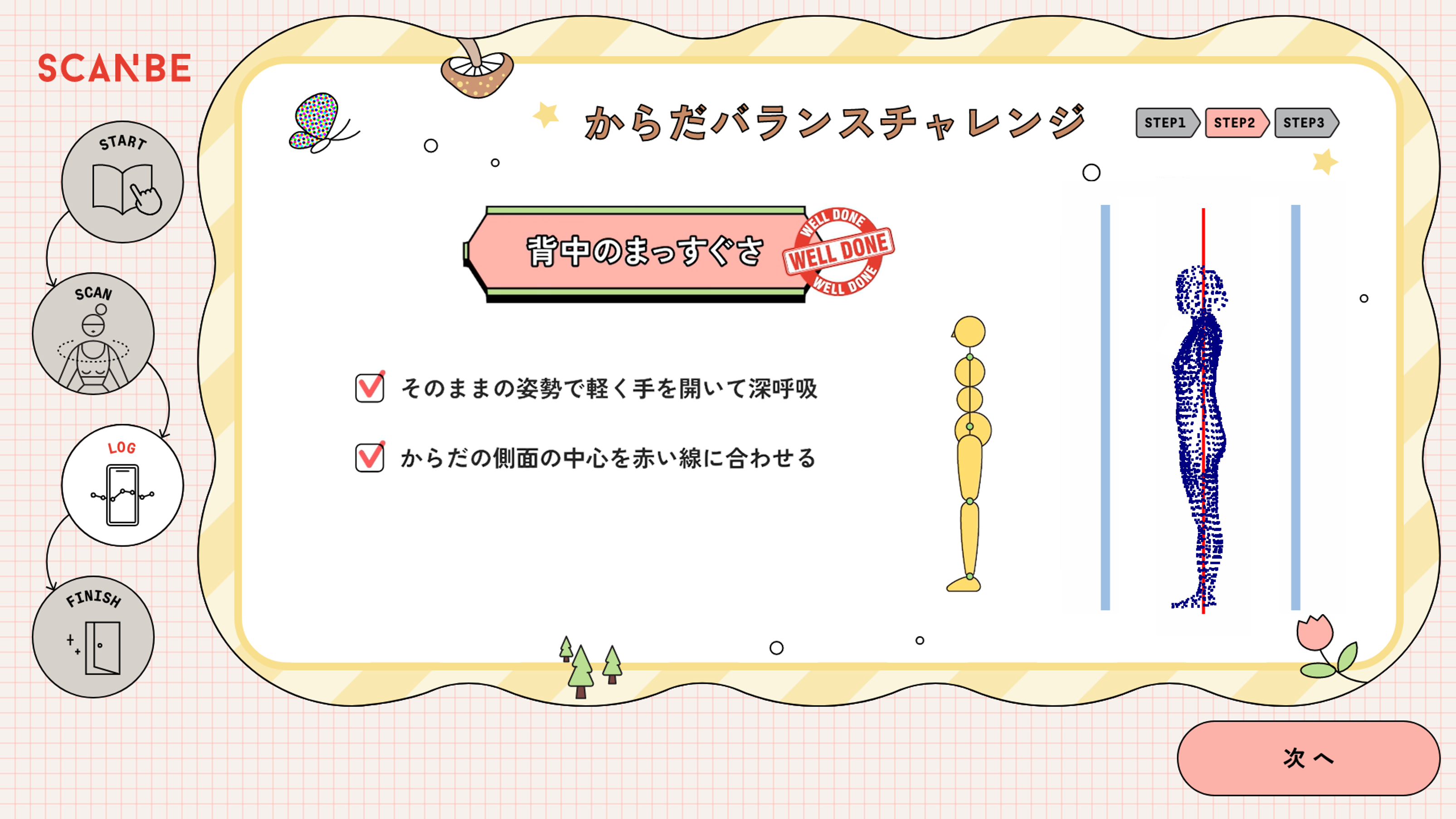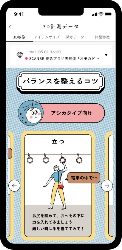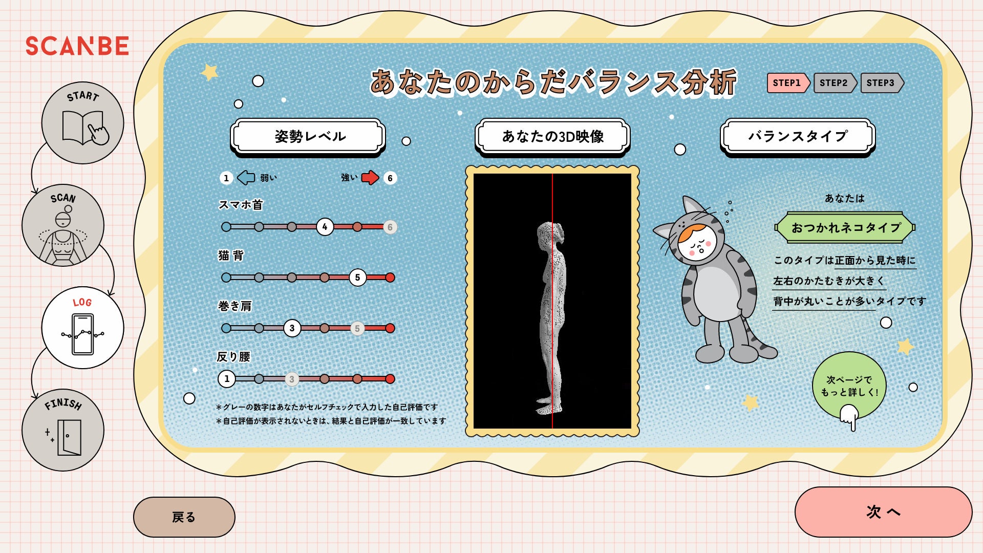 「SCANBE」から新有料サービス[からだバランス診断]が登場!「スマホ首」「猫背」などの姿勢レベルがわかり、その場でバランスをととのえるコツを体験