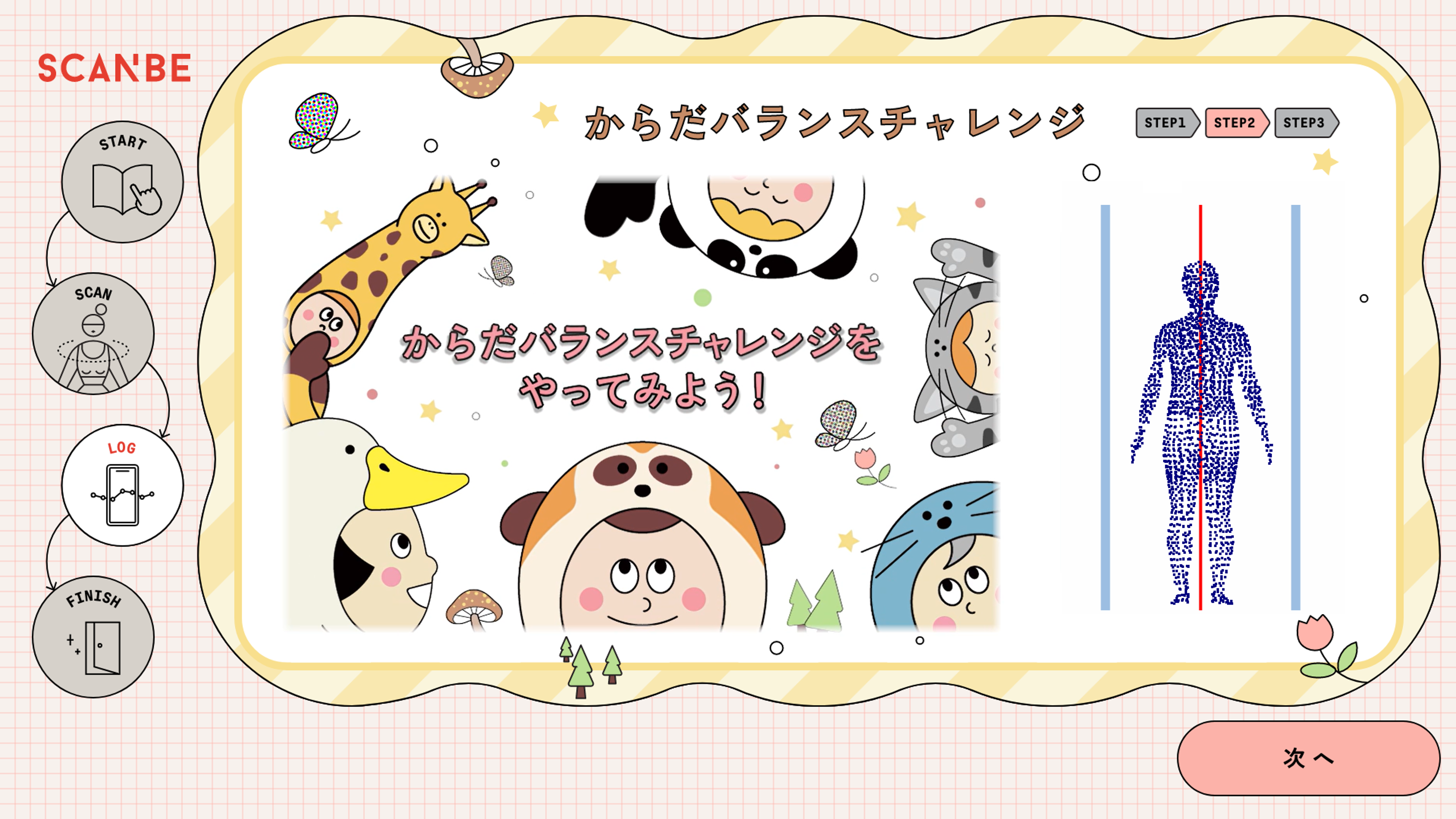 ●3Dスキャンにより得られたボディデータをもとに、「スマホ首」「猫背」などの姿勢レベルや、動物をモチーフにした6種類のバランスタイプを診断。診断後には、スキャナー内でリアルタイムに自分の姿を確認しながら、からだのバランスをととのえるポイントがわかる“バランスチャレンジ”を体験できます。