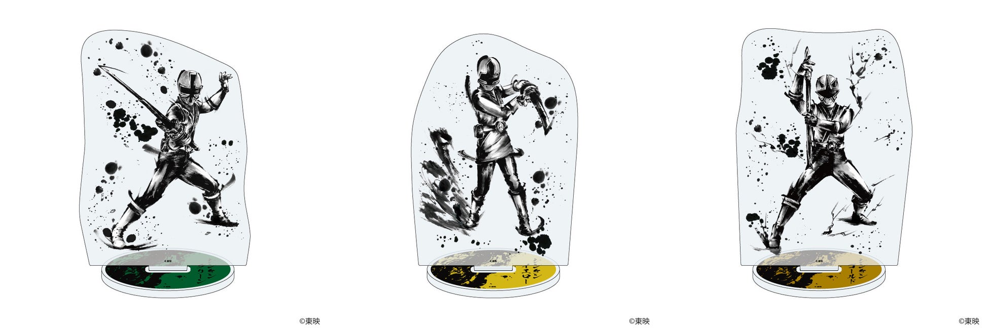 華麗な太刀さばきが水墨イラストで表現された、縦横最大15cmのアクリルスタンド。秘伝再生刀シンケンマルや斬撃勘定刀サカナマルを手にした侍達を、じっくり眺めることができます。