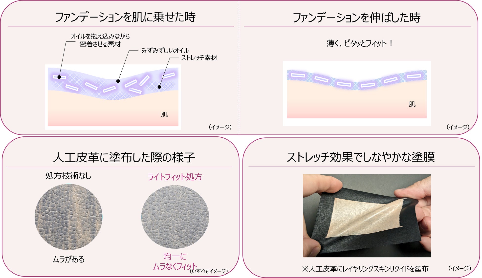 みずみずしい感触で伸びがよく、ひと塗りでムラなくキレイに密着。ストレッチ素材が肌の動きに合わせてついていき、ヨレにくい。日中も負担感のない軽やかなつけ心地ながら、乾燥を感じにくく、美しい仕上がりを持続します。
