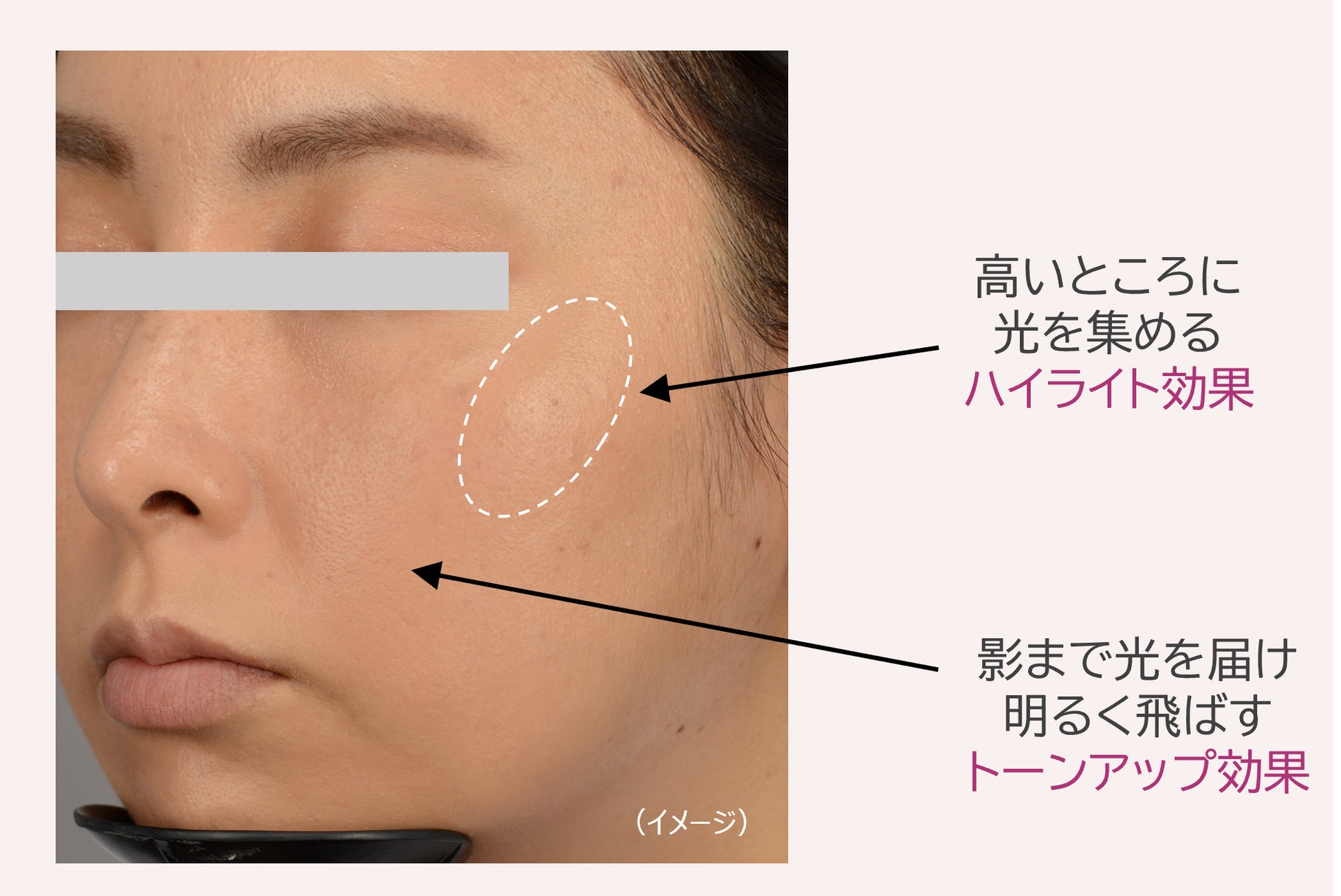 ●頬の高いところに光を集めて、立体感を演出。毛穴などの細かい影まで飛ばし、トーンアップした透明感のある肌印象に仕上げます。