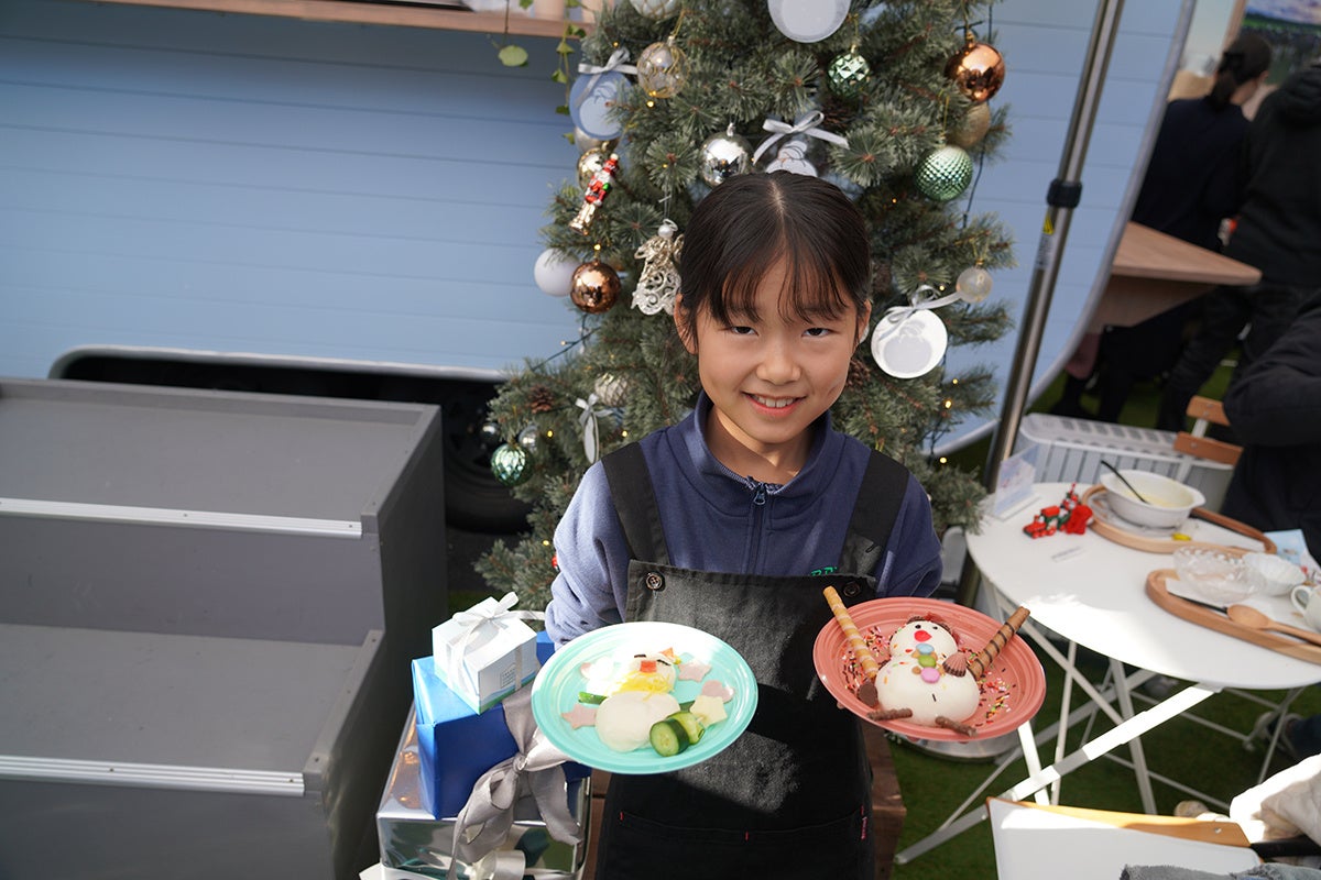 写真左は、実際にキッチンに入ってモッツァレラの手作り体験。写真右は、手作りモッツァレラ「雪だるま&トナカイ」の完成披露。
