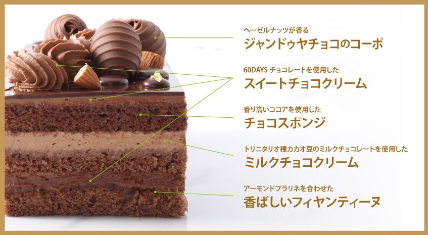 カカオの収穫後 60 日以内に加工した今までにないチョコレートの香りに出会い、そのフルーティーなアロマを存分に生かし、 味わい深いチョコレートケーキに仕立てました。