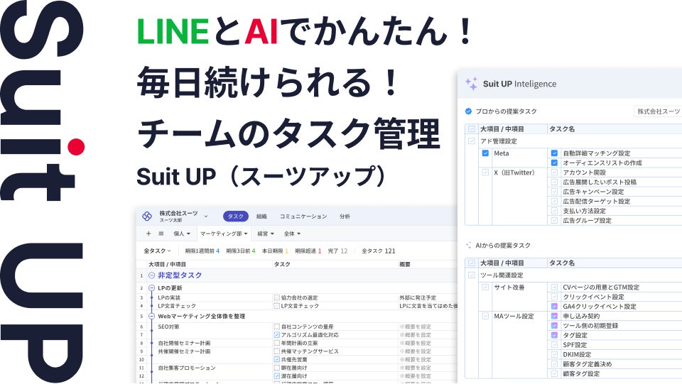 株式会社スーツ(所在地:東京都千代田区、代表取締役社長CEO:小松 裕介)は、AIタスク管理・プロジェクト管理ツール「スーツアップ」が、LINE連携を機能追加したことをお知らせいたします。