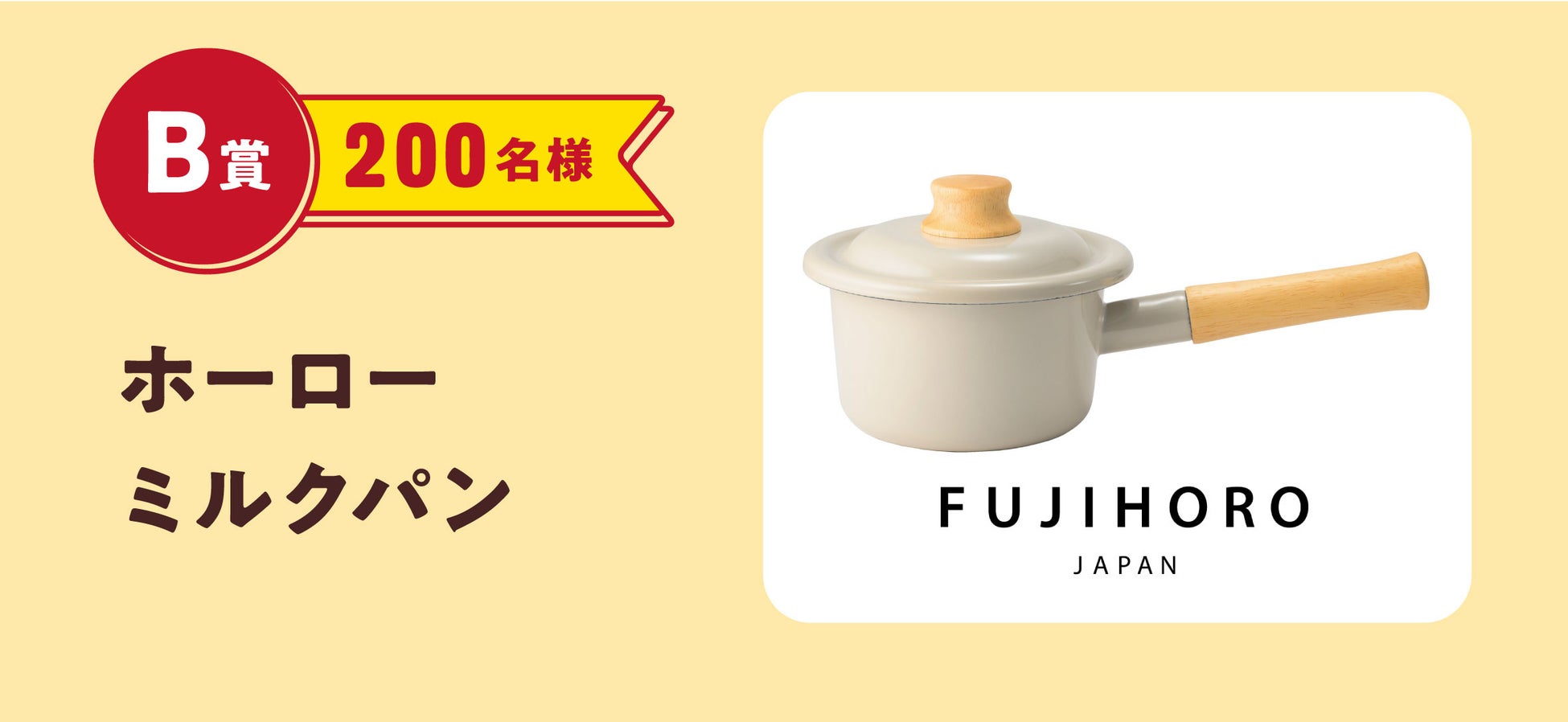 対象商品1個以上お買い上げ頂いた購入レシートを撮影のうえ、特設サイトの応募フォームからご応募いただけます。ご応募いただいた方の中から抽選で合計400名様に、A賞コラボ限定ちびまる子ちゃん親子マグセット(200名様)、B賞ホーローミルクパン(200名様)をプレゼントいたします。