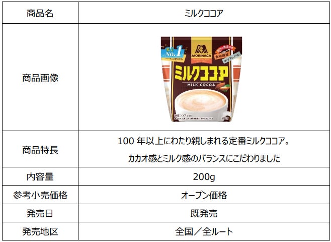 ・対象商品:森永製菓ココア商品各種(ミルクココア200g/純ココア110g/カカオの力<CACAO70>200g/牛乳で飲むココア180g/割るだけココア240gなど)