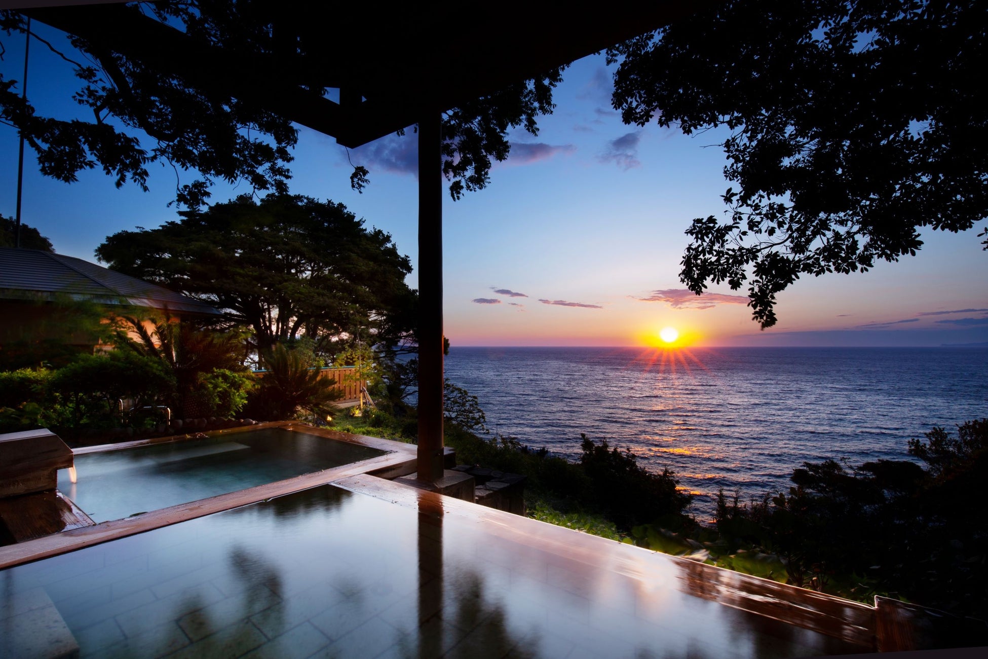 静かな海沿いの北川温泉(ほっかわおんせん)高台から、海に昇る朝日と満月が描く光の道「ムーンロード」を望む全室オーシャンビュー、大人の隠れ家リゾート。
