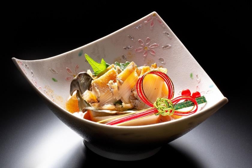 ご夕食には、金目鯛や伊勢海老、鮑など贅を極めた食材を気取らずお箸でいただく、特選フレンチ懐石コースをご用意。