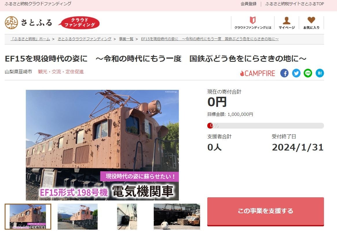 山梨県韮崎市とさとふる、老朽化した「EF15形電気機関車」を修復し、本来の姿で後世へ残すため寄付受け付けを開始