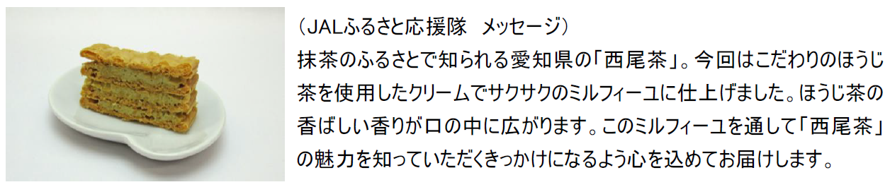 抹茶のふるさとで知られる愛知県の「西尾茶」。今回はこだわりのほうじ茶を使用したクリームでサクサクのミルフィーユに仕上げました。ほうじ茶の香ばしい香りが口の中に広がります。このミルフィーユを通して「西尾茶」の魅力を知っていただくきっかけになるよう心を込めてお届けします。