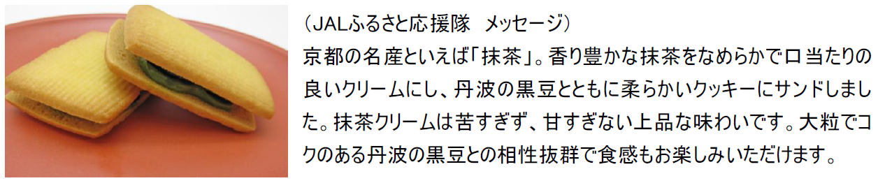 京都の名産といえば「抹茶」。香り豊かな抹茶をなめらかで口当たりの良いクリームにし、丹波の黒豆とともに柔らかいクッキーにサンドしました。抹茶クリームは苦すぎず、甘すぎない上品な味わいです。大粒でコクのある丹波の黒豆との相性抜群で食感もお楽しみいただけます。