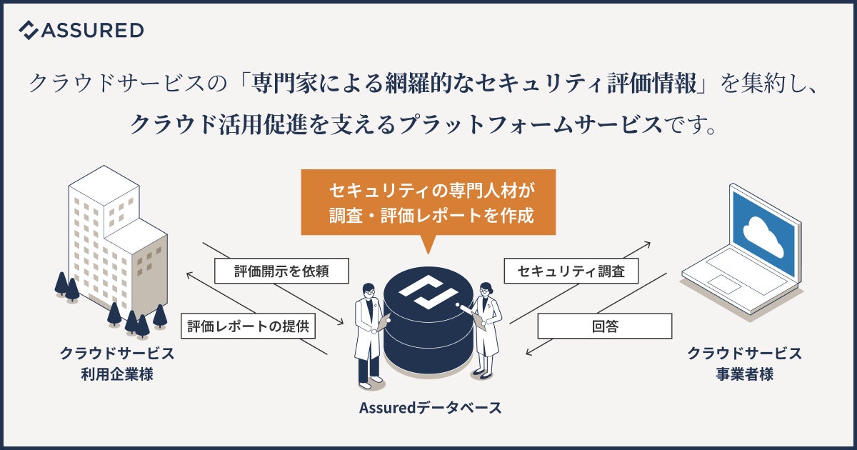 Assuredは、SaaS/ASPなどのクラウドサービスの安全性を可視化するプラットフォームです。専門知識を有するセキュリティ評価チームが、主要なガイドラインやフレームワークに基づき、クラウドサービスのセキュリティ対策状況を調査し、その評価結果をデータベースに集約することで、効率的かつ高精度なセキュリティ評価を実現します。また、クラウドサービス事業者は、Assuredによるセキュリティ評価情報を用いて自社サービスの安全性を示すことができ、利用企業・事業者双方を繋ぐ役割として、企業の安全なクラウド活用、そして社会全体のDX推進を支えます。
