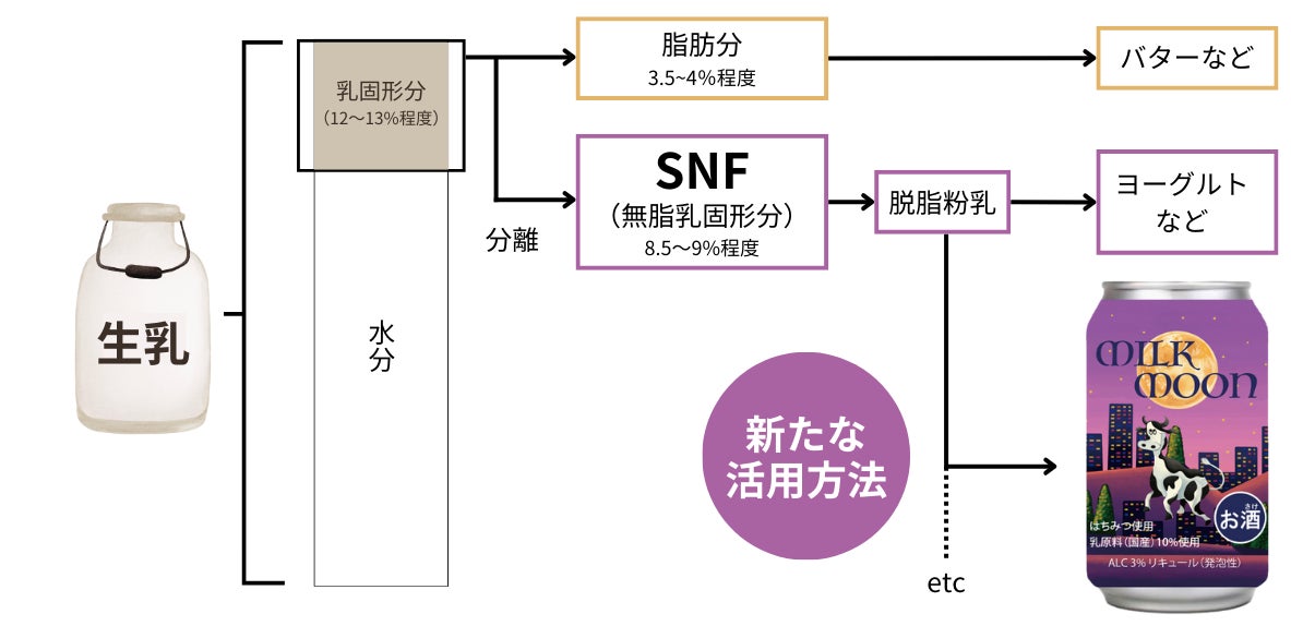 バター等の乳製品の製造工程において、生乳から脂肪分を抽出する際、生乳から水分と脂肪分を除いた成分であるSNF原料(無脂乳固形分)が製造されます。SNF原料は、脱脂粉乳等に加工されますが、バター等に利用される脂肪分に比べて需要が少なく、バター等の需要増加に伴い、SNF原料の有効活用が模索されています。 今回、様々な余剰食材をアップサイクルしてアルコール飲料を製造している株式会社Beer the Firstと、乳製品の製造を行う株式会社 明治の2社が連携し、SNF原料を使って、ミルクのまろやかな味わいを感じられるアルコール飲料を開発しました。 生乳から生まれるSNF原料を有効活用する商品を開発することで、乳業業界や地域経済への持続的な貢献が期待されます。 |