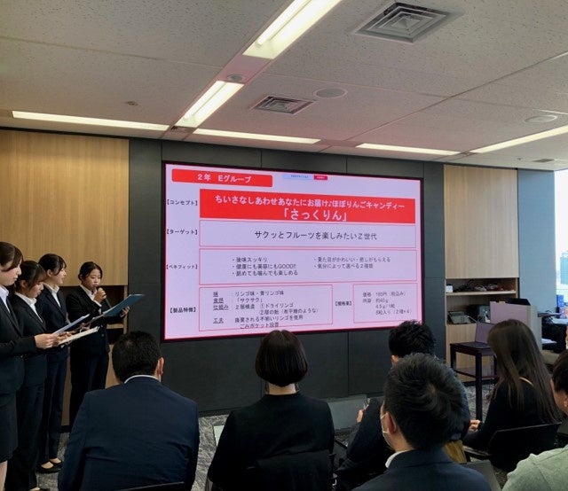 「さっくりん」は、“Z世代向けのハードキャンディ”をテーマに、専修大学商学部マーケティング学科の学生が立案したアイデアから共創した商品の第2弾です。産学連携に積極的に取り組みマーケティング研究を専門とする増田ゼミ協力のもと、学生のアイデアとカンロの開発技術を掛け合わせることで商品化を実現しました。