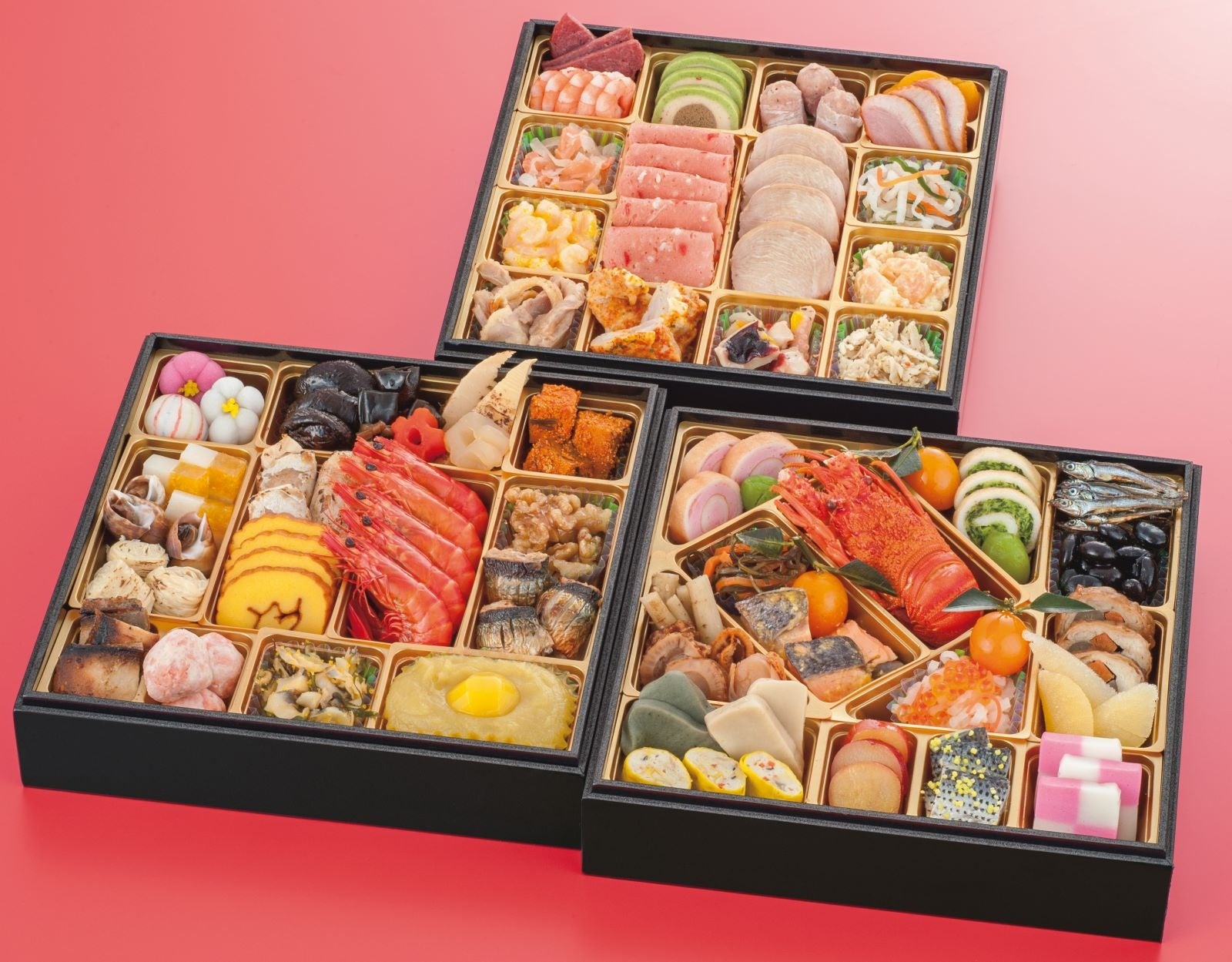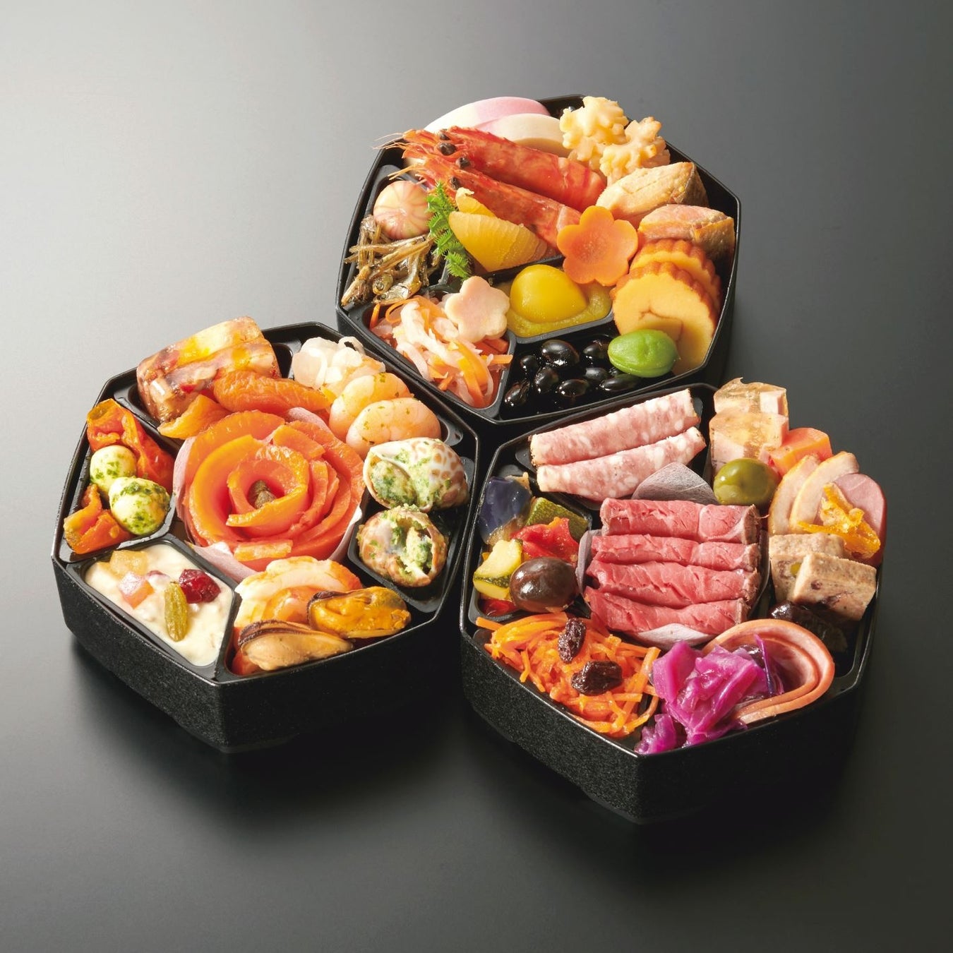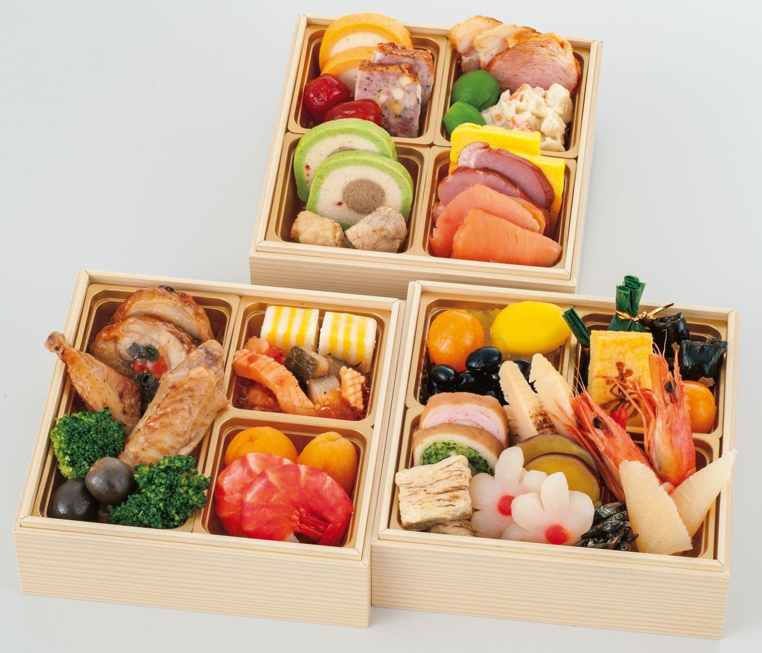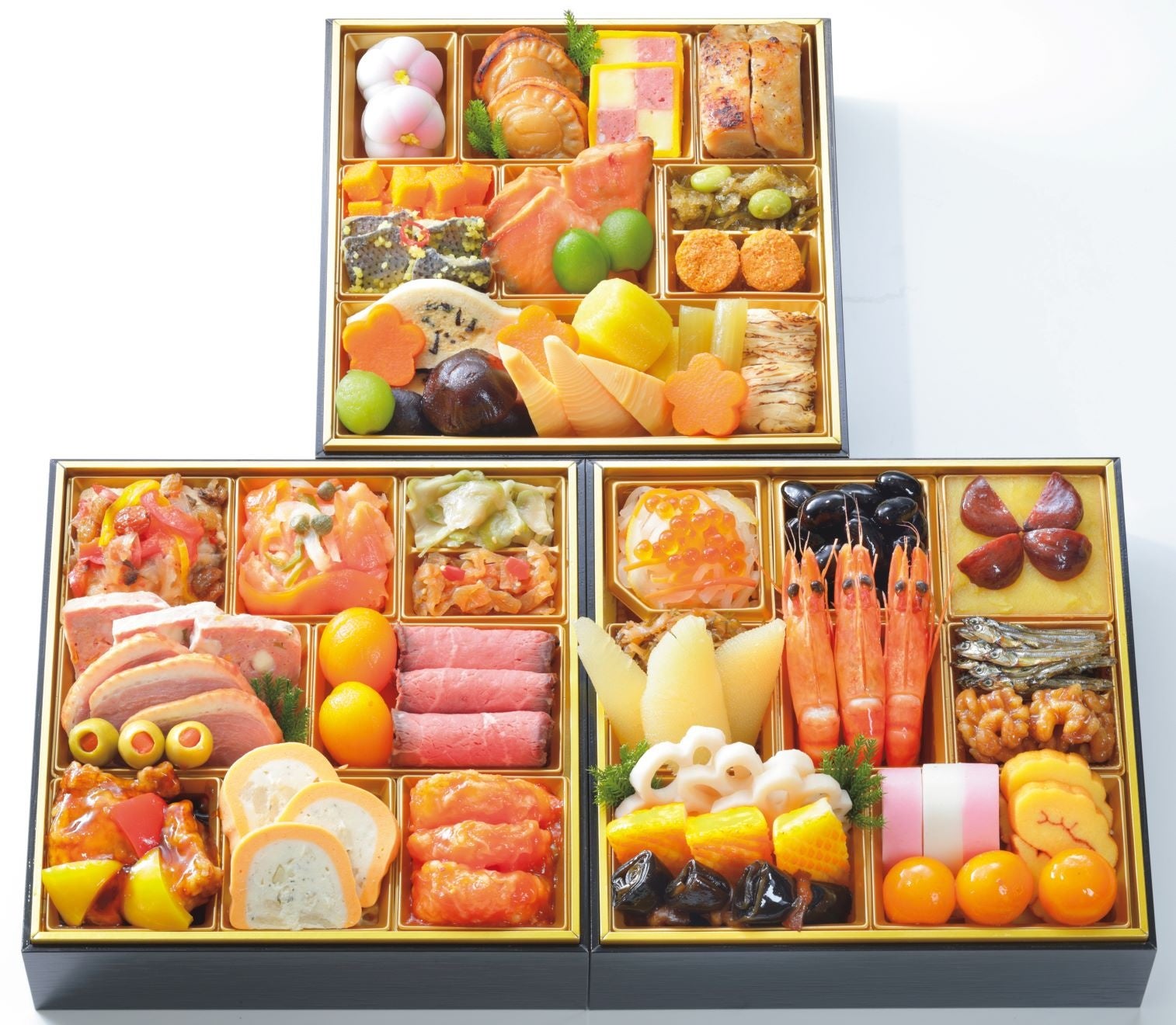 【内容】田作りや黒豆煮、味付け数の子など祝い肴をはじめとする伝統的な和の食材と、ローストビーフやチーズ入りミートテリーヌといった洋の食材に、エビのチリソースなどの中華の食材を加え、バランスよく華やかに盛り付けました。多彩な味わいの和洋中の三段重です。