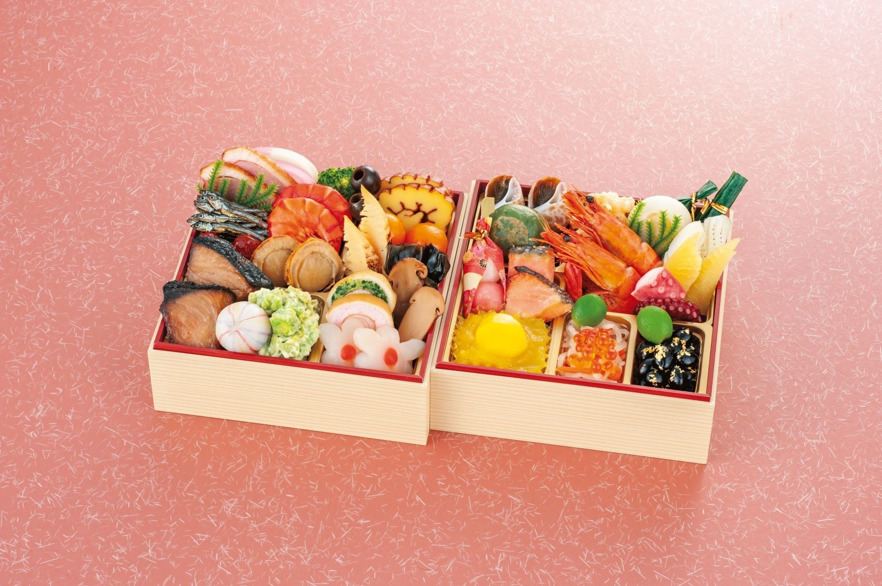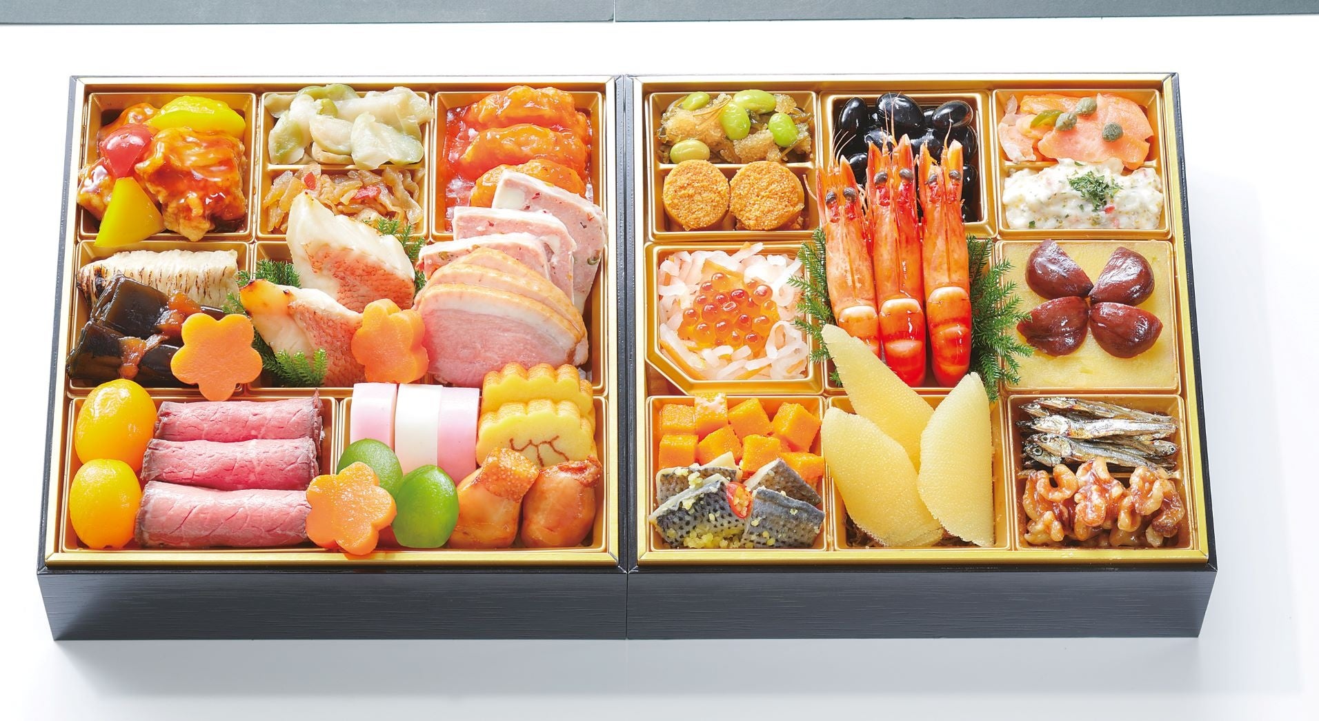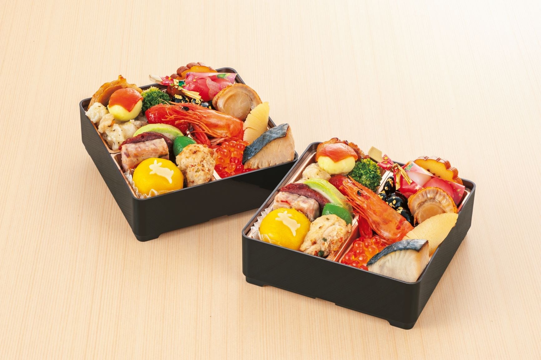 【内容】迎春に相応しい和風の味わいはもちろん、黒酢酢豚などの中華テイストや、お肉食材も盛り付けることで、お子様から大人まで多彩な味わいを楽しむ事のできる和洋中の二段重となっております。