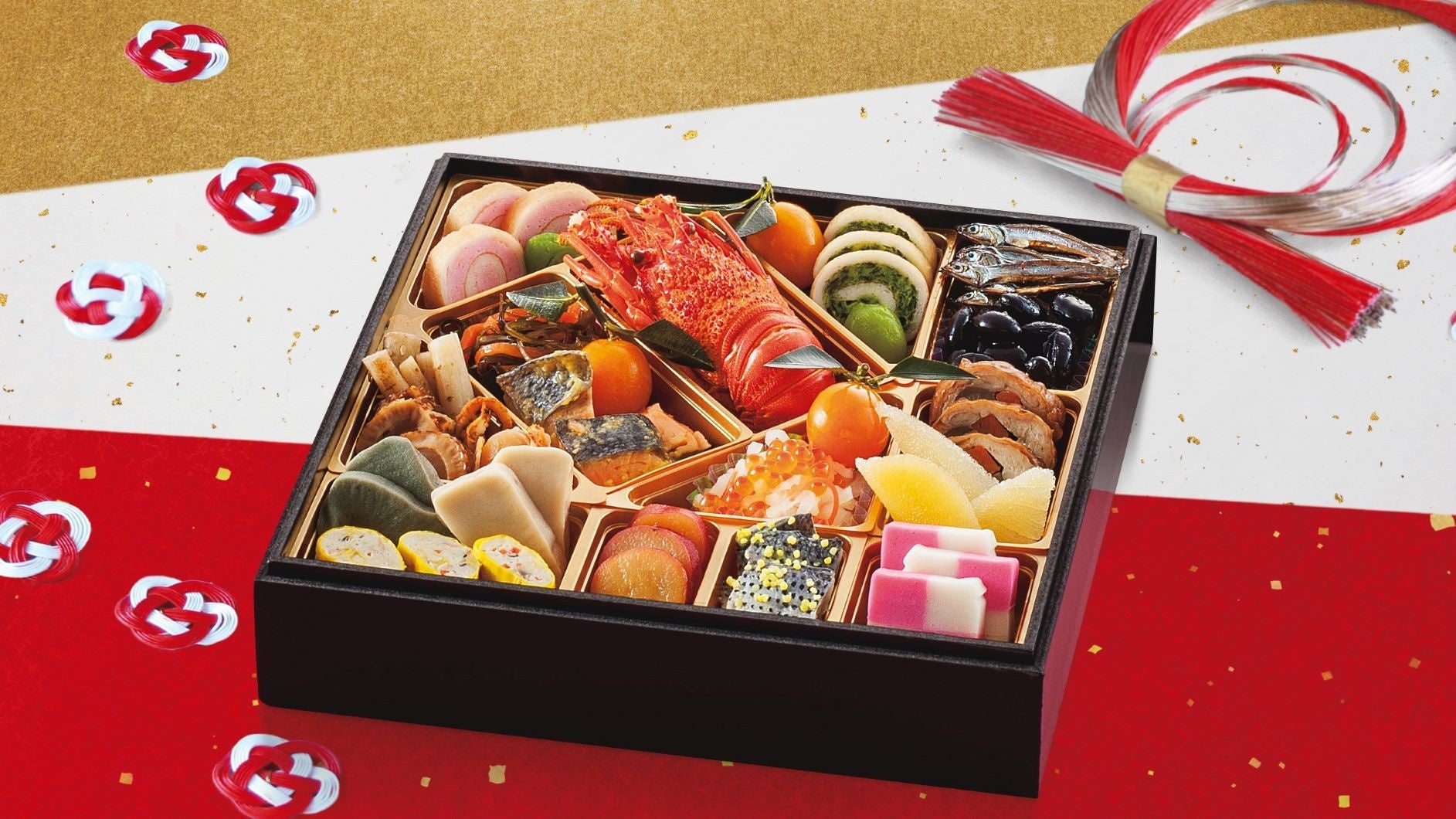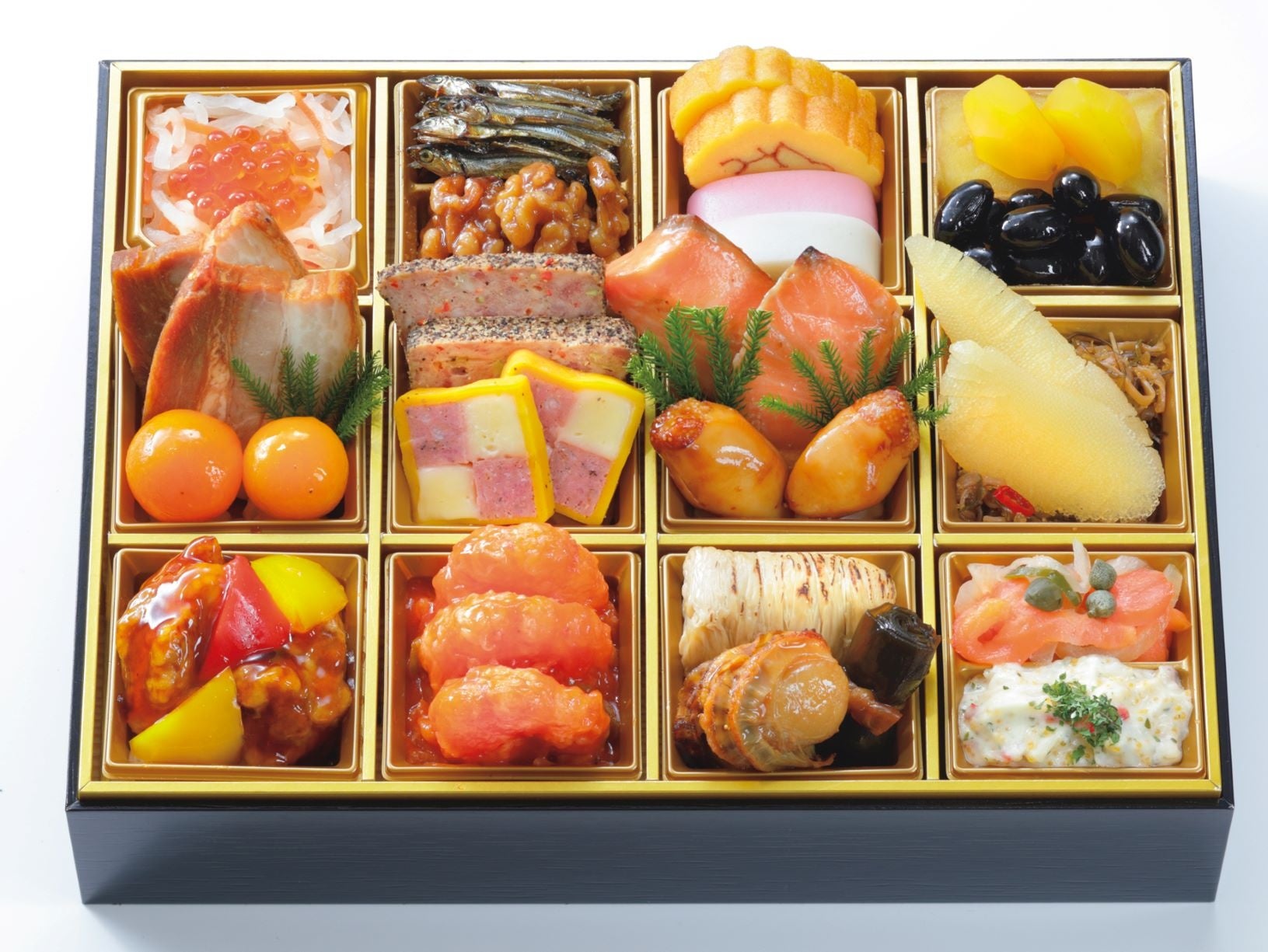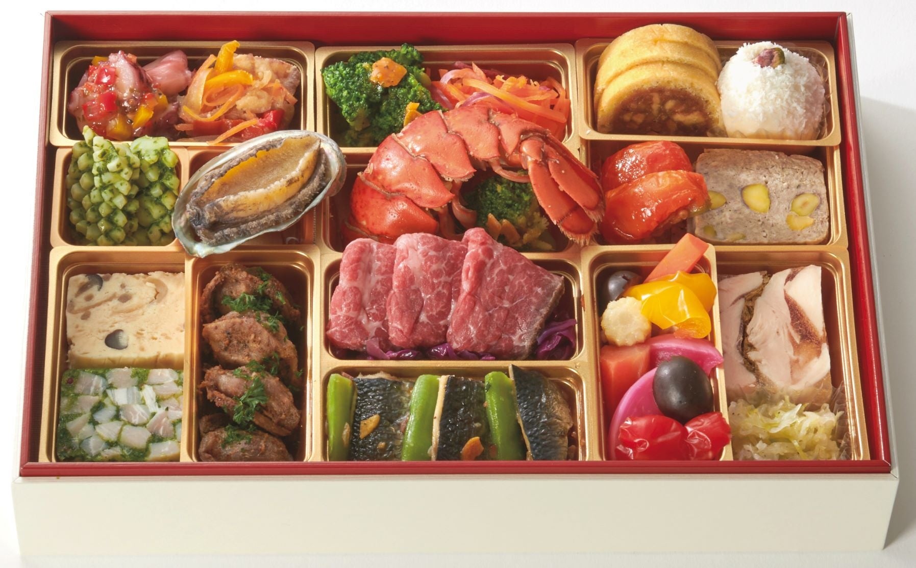 【内容】迎春に相応しい和風の味わいはもちろん、黒酢酢豚などの中華テイストや、お肉食材も盛り付けることで、お子様から大人まで多彩な味わいを楽しむ事のできる和洋中の二段重となっております。