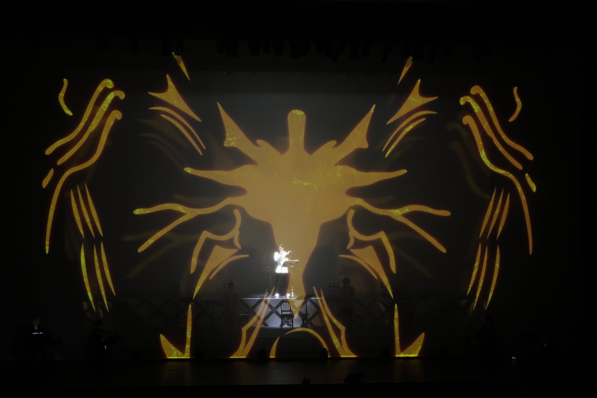 紗幕を使った映像演出も印象的。ガリカが飛び回る様子や、戦闘時の攻撃演出などが紗幕に映し出され、没入感をいっそう高める。とくに正体不明の怪物ニンゲンがステージ上に映し出される瞬間は圧巻で、その歪な恐ろしさを目の当たりにすることができる。