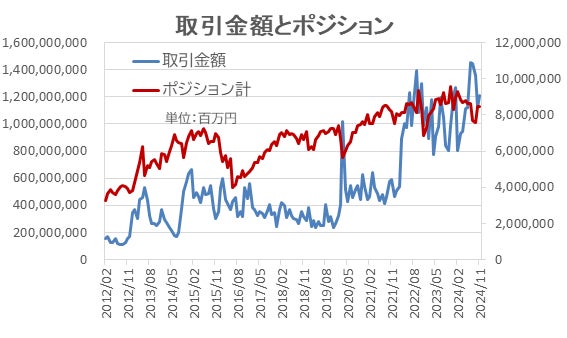 金融先物取引業協会が12月13日に公表した資料によると、2024年11月の店頭FXにおける取引金額は1208兆円と、10月の1119兆円から約8.0%増加した。USD/JPY(米ドル/円)やEUR/JPY(ユーロ/円)の取引額増加が全体を押し上げた。