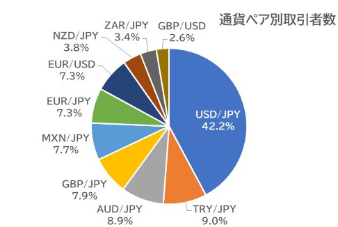 通貨ペア別取引者数のトップ10は、USD/JPY(米ドル/円)・TRY/JPY(トルコリラ/円)・AUD/JPY(豪ドル/円)・GBP/JPY(ポンド/円)・MXN/JPY(メキシコペソ/円)・EUR/JPY(ユーロ/円)・EUR/USD(ユーロ/米ドル)・NZD/JPY(NZドル/円)・ZAR/JPY (南アフリカランド/円)・GBP/USD(ポンド/米ドル)の順。