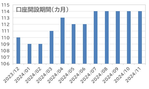 取引をしたFX投資家の口座開設後の期間は、平均114カ月(9年6カ月)と、前月から横ばい。中長期的にみれば、緩やかな拡大傾向は続いていると判断できるが、直近は頭打ち傾向が顕著になり始めている。