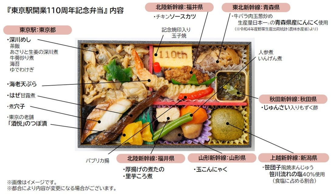 東京駅開業110周年記念弁当は、東京都内だけでなく、JR東日本エリアの各新幹線が繋がる地域の名物を、ひとつのお弁当の中で楽しめる商品を目指して、各地の出身者や、普段から駅弁が好きな東京駅の駅員に行ったアンケートから実現しました。