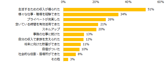 派遣で働いたことがある方に「派遣で働くことで叶えられたことは何ですか?」と伺うと、上位は「生活するための収入が得られた」(51%)、「様々な仕事・職場を経験できた」(34%)、「プライベートが充実した」(26%)でした。叶えられたことについて、具体的なエピソードも紹介します。