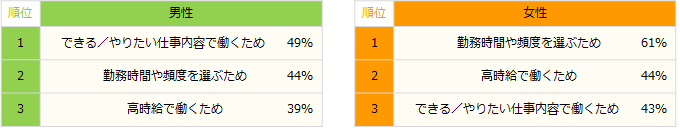 男女別で見ると、トップ3のラインナップは共通でしたが、順位に差があることが分かりました。男性の回答第1位の「できる/やりたい仕事内容で働くため」は女性回答では3位(男性:49%、女性:43%)。「勤務時間や頻度を選ぶため」は男性が第2位(44%)に対し女性は第1位(61%)「高時給で働くため」は男性が第3位(39%)に対し、男性は第2位(44%)でした。