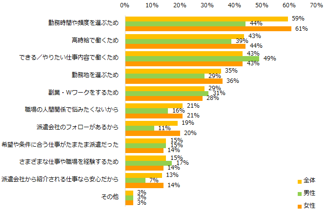 派遣で働きたい理由を伺うと、第1位は「勤務時間や頻度を選ぶため」(59%)でした。