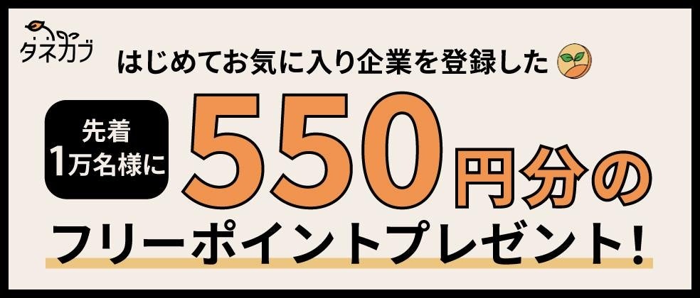【条件】タネカブアプリをダウンロードして、お気に入り企業の登録を初めてすると先着1万名様に登録企業の株式購入に利用可能な550円相当のフリーポイントをプレゼント。