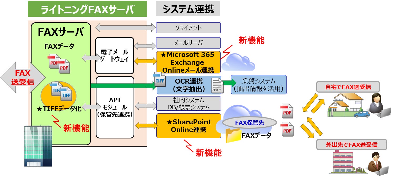 電子メールサーバと連携し、メールクライアント画面からのFAX送信指示や、受信FAXイメージが添付されたメールの受信を行うことができ、「Microsoft 365 Exchange Online」に対応しました。