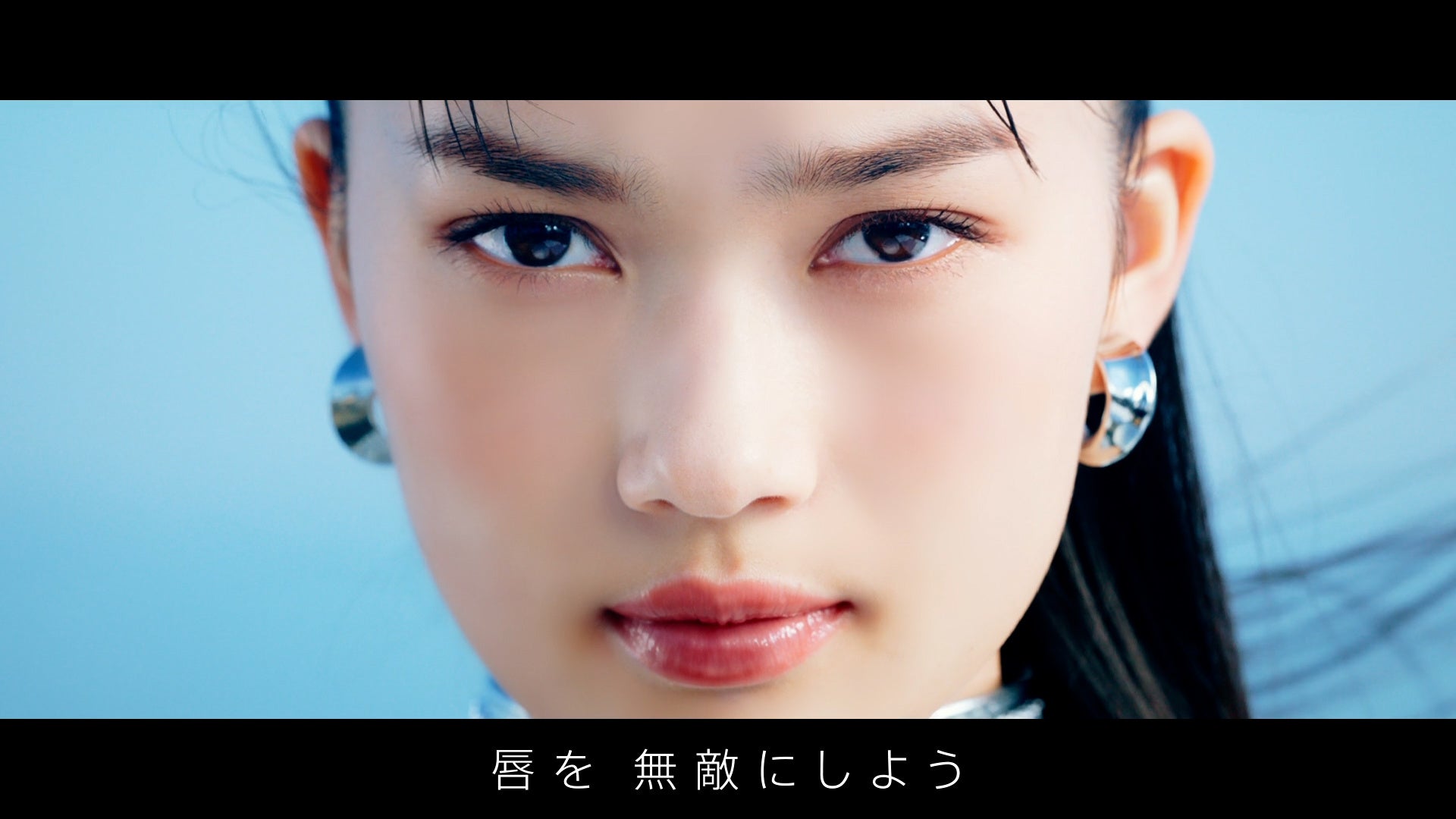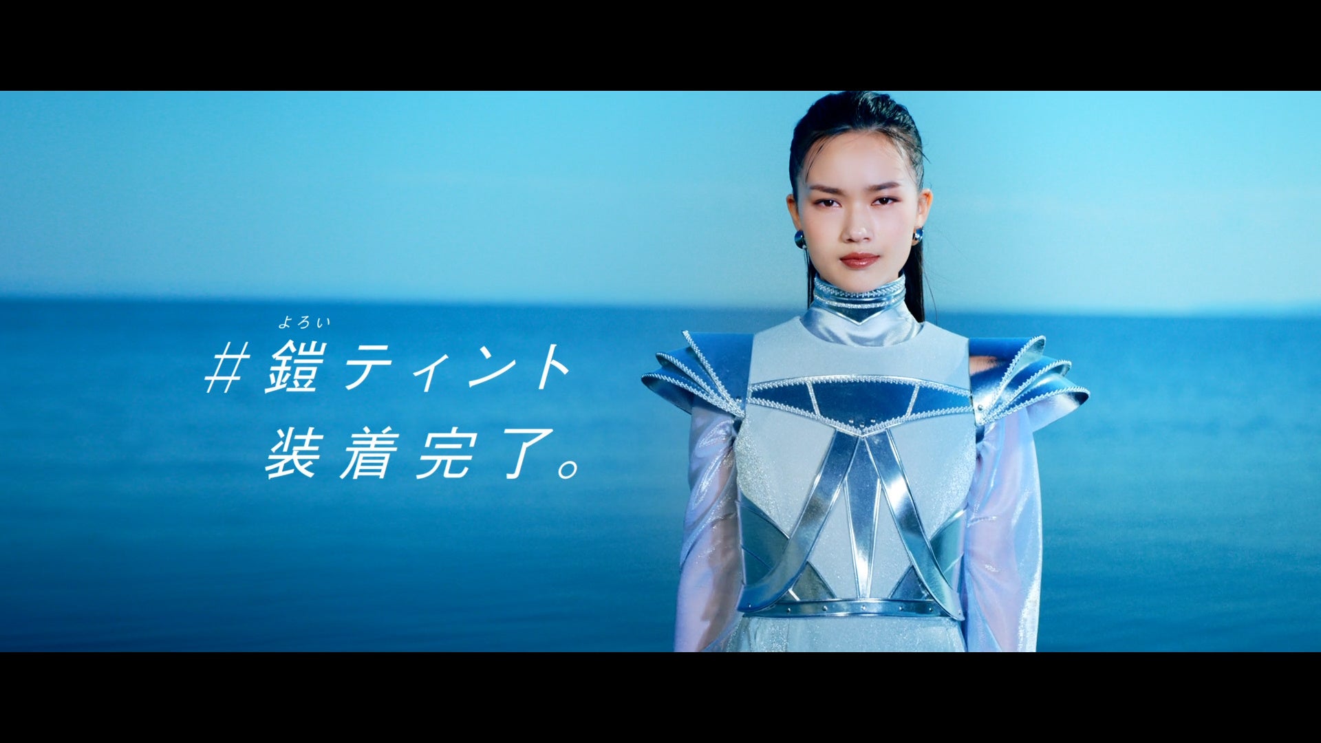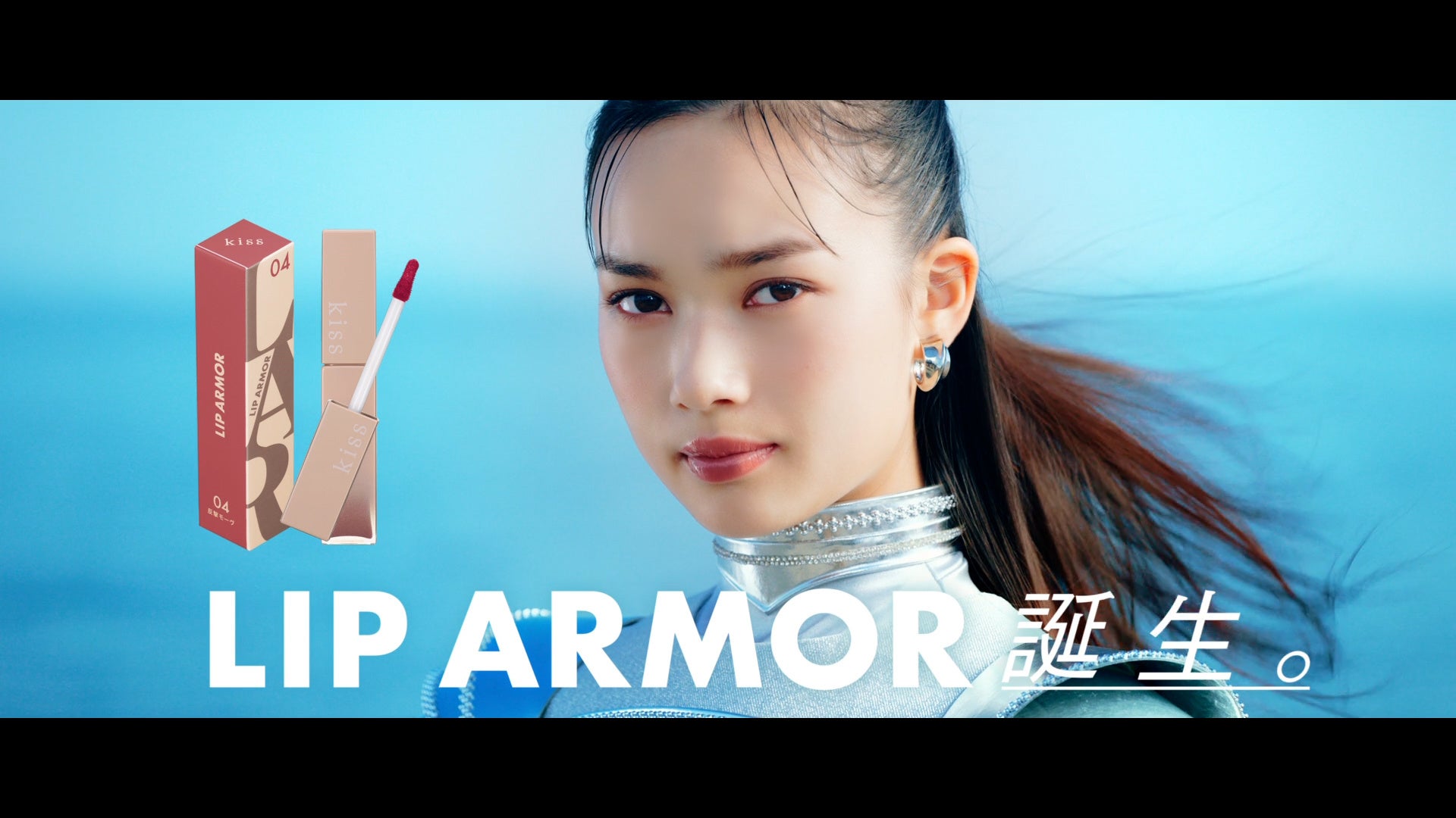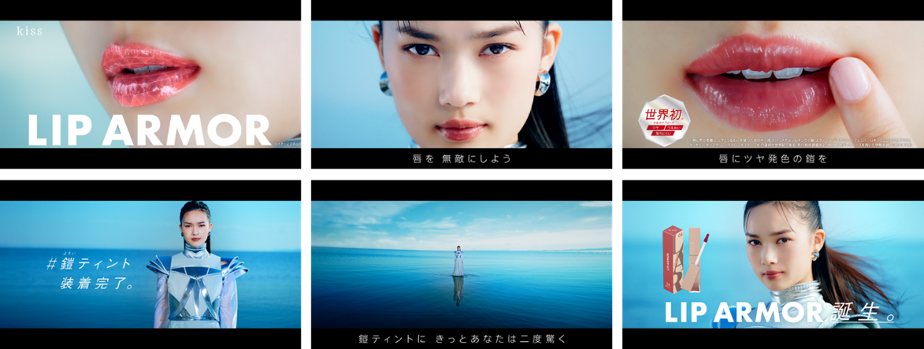 この衣装をまとった新井さんの「唇を無敵にしよう」という力強いメッセージの後、「キス リップアーマー」を塗布した(装着した)ツヤ、うるおいをたたえた唇が映し出されます。