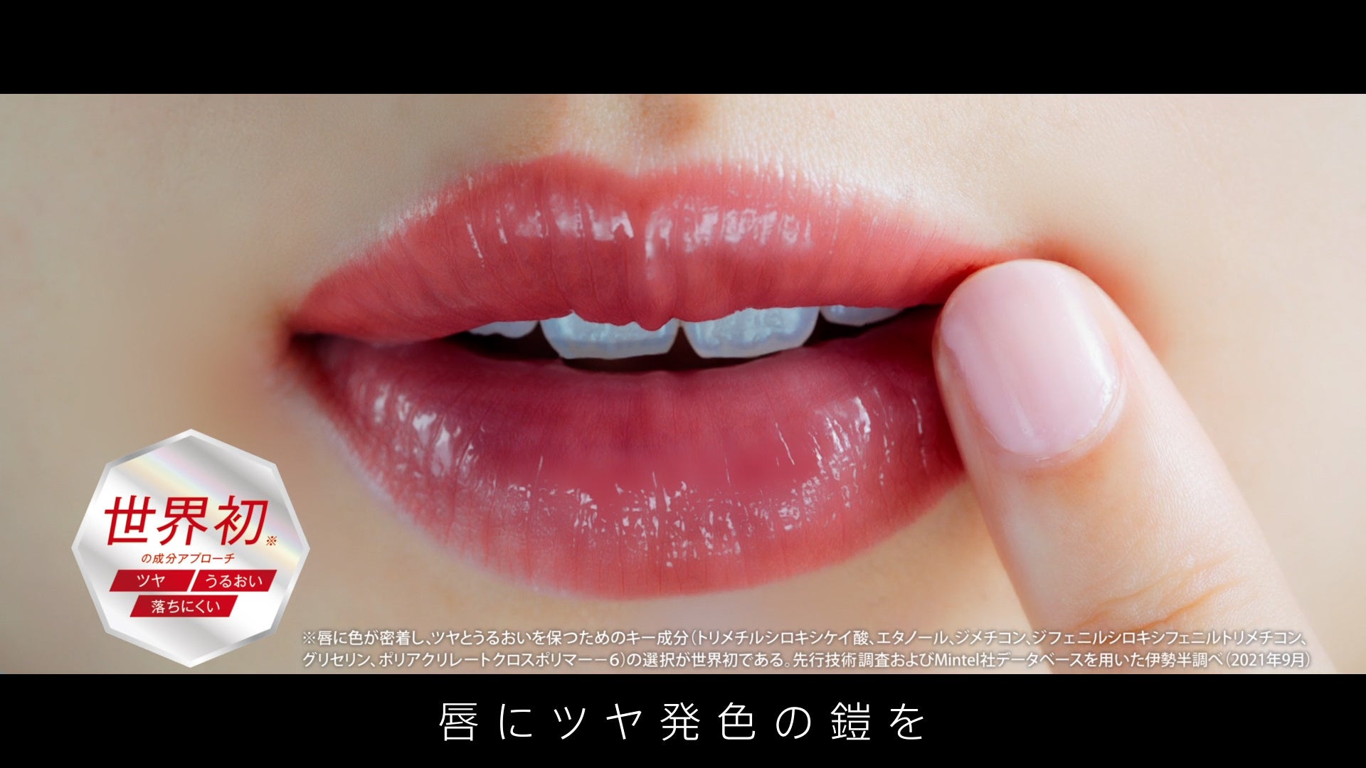 ※1 唇に色が密着し、ツヤとうるおいを保つためのキー成分 (トリメチルシロキシケイ酸、エタノール、ジメチコン、ジフェニルシロキシフェニルトリメチコン、グリセリン、ポリアクリレートクロスポリマー-6)の選択が世界初である。先行技術調査およびMintel社データベースを用いた伊勢半調べ(2021年9月)。