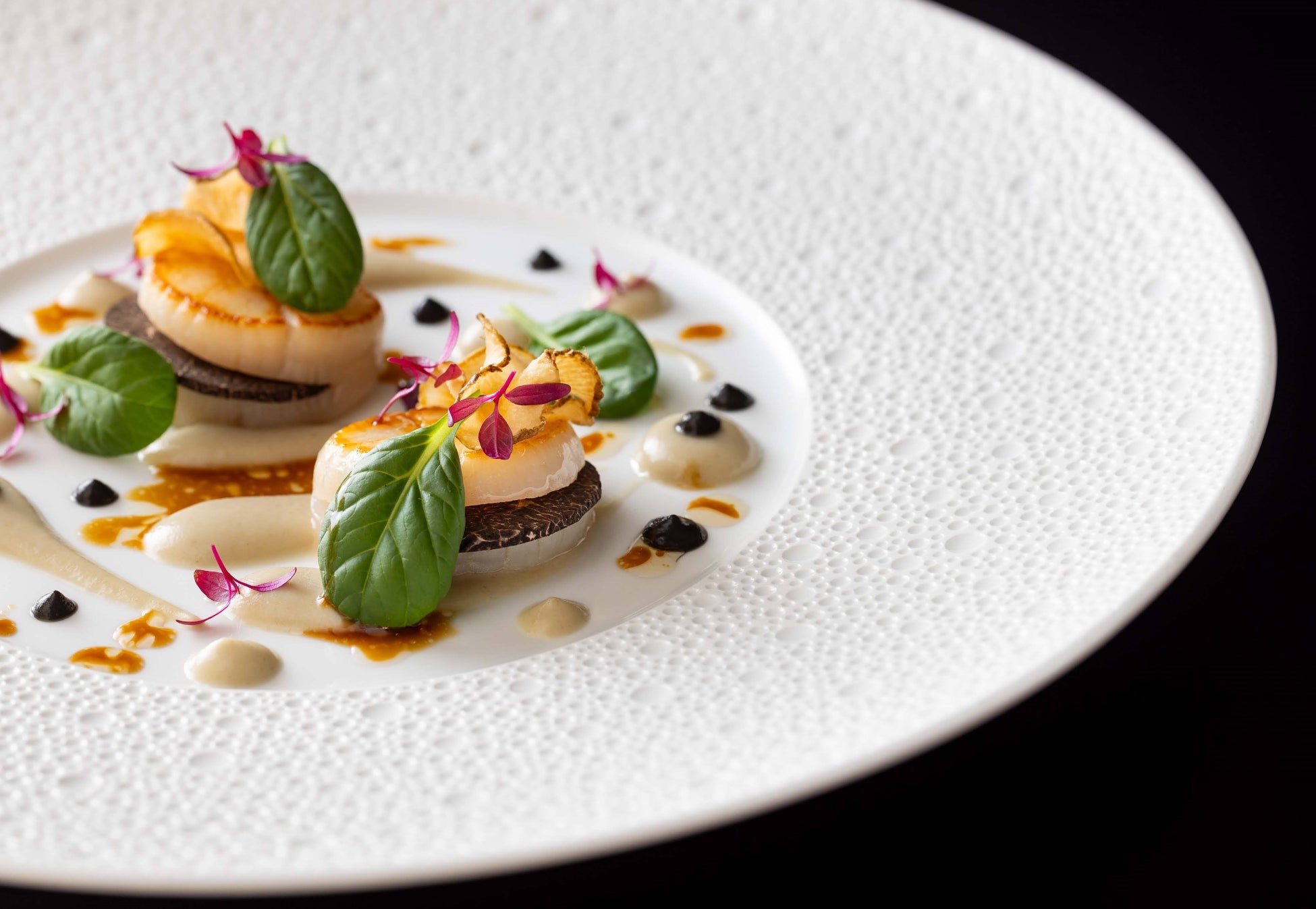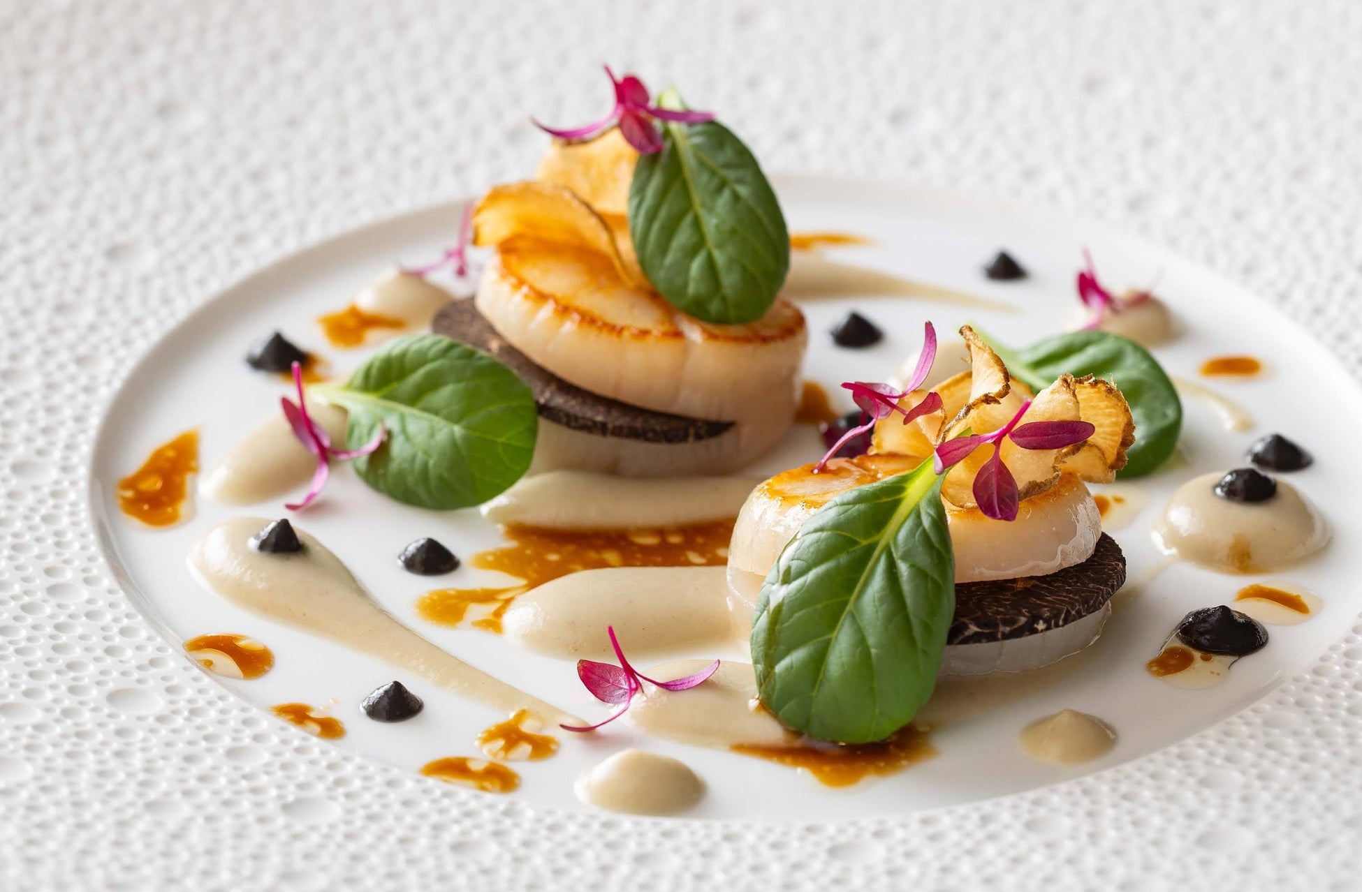 黒トリュフを帆立貝で挟んでポワレにしました。帆立貝の甘みとトリュフの華やかな香りを存分に感じていただけるよう、トピナンブールのピュレとトリュフのクーリと共にお召し上がりください。