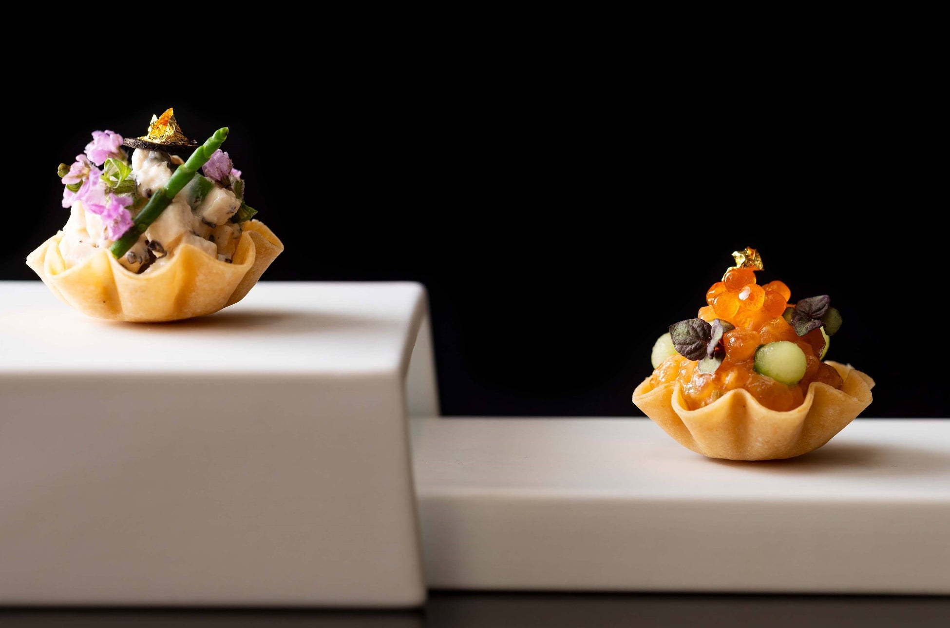 今年のアミューズブーシュは2種類。しっとりと火をいれた丹波赤どりと黒トリュフの香りをお楽しみいただける一品と、細かく刻んだサーモンにケッパー、アクセントにとびっことマスの卵を添えて様々な食感をお楽しみいただけるタスマニアサーモンのタルタルをご用意いたしました。