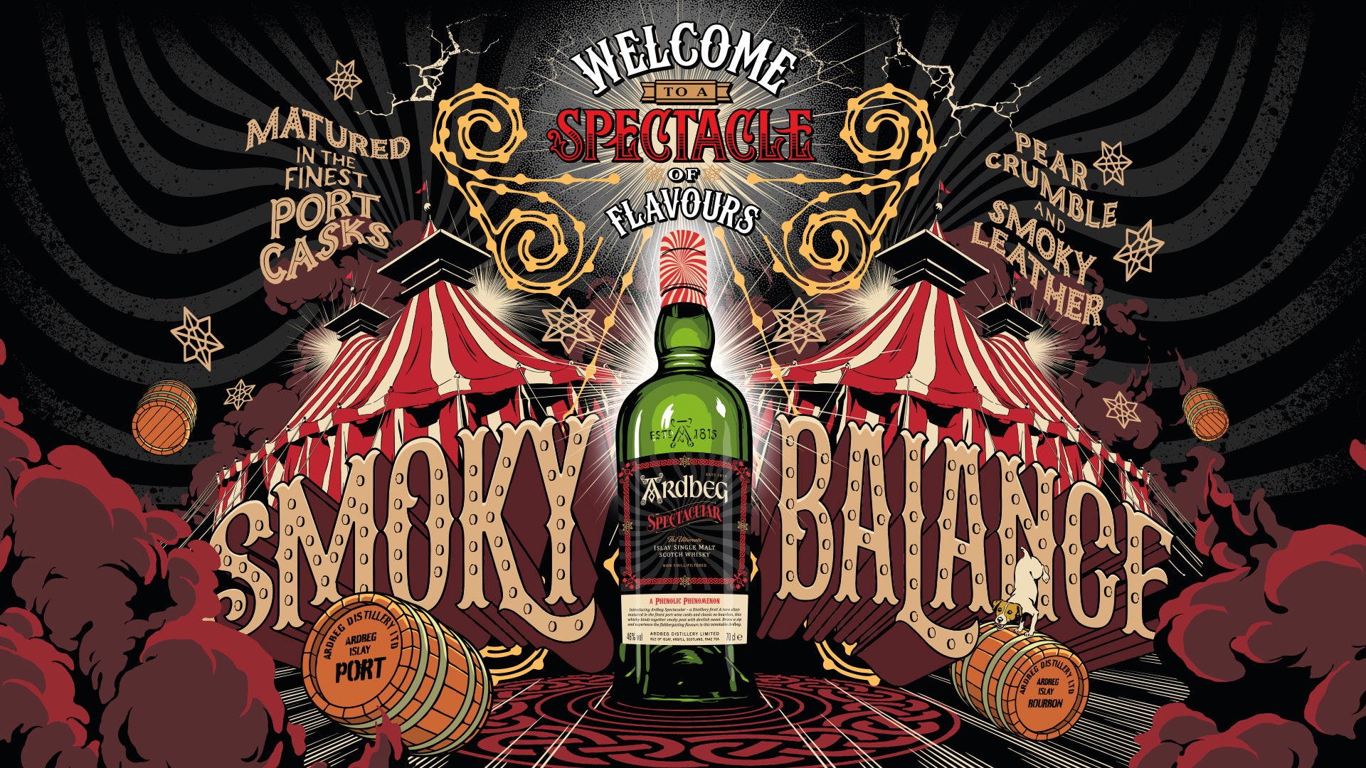2024年の限定ボトルは、「アードベッグ スペクタキュラー」。アードベギャンすら予想できなかった、未知のフレーバーが広がります。バーボン樽で熟成されたアードベッグならではのピーティーでスモーキーなウイスキーに、アードベッグ史上初のポートワイン樽熟成によるダークでスイートなウイスキーをヴァッティング。華麗なスピンを見せる色合いで、ダークチョコレート、ミント、砂糖漬けのフルーツやスモークしたピーカンナッツの風味が空中ブランコさながらに宙を舞います。この常識にとらわれないディープでダークなフレーバーの饗宴は、まさにピートが主演の「ダークサーカス」。センセーショナルな味わいのパレードを幕開けに、みなさまをスペクタクルな「ダークサーカス」ショーの世界へご招待いたします!