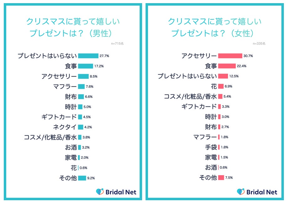 クリスマスに貰って嬉しいプレゼント、1位は男性「プレゼントはいらいない(27.7%)」、女性「アクセサリー(30.7%)」という結果に。