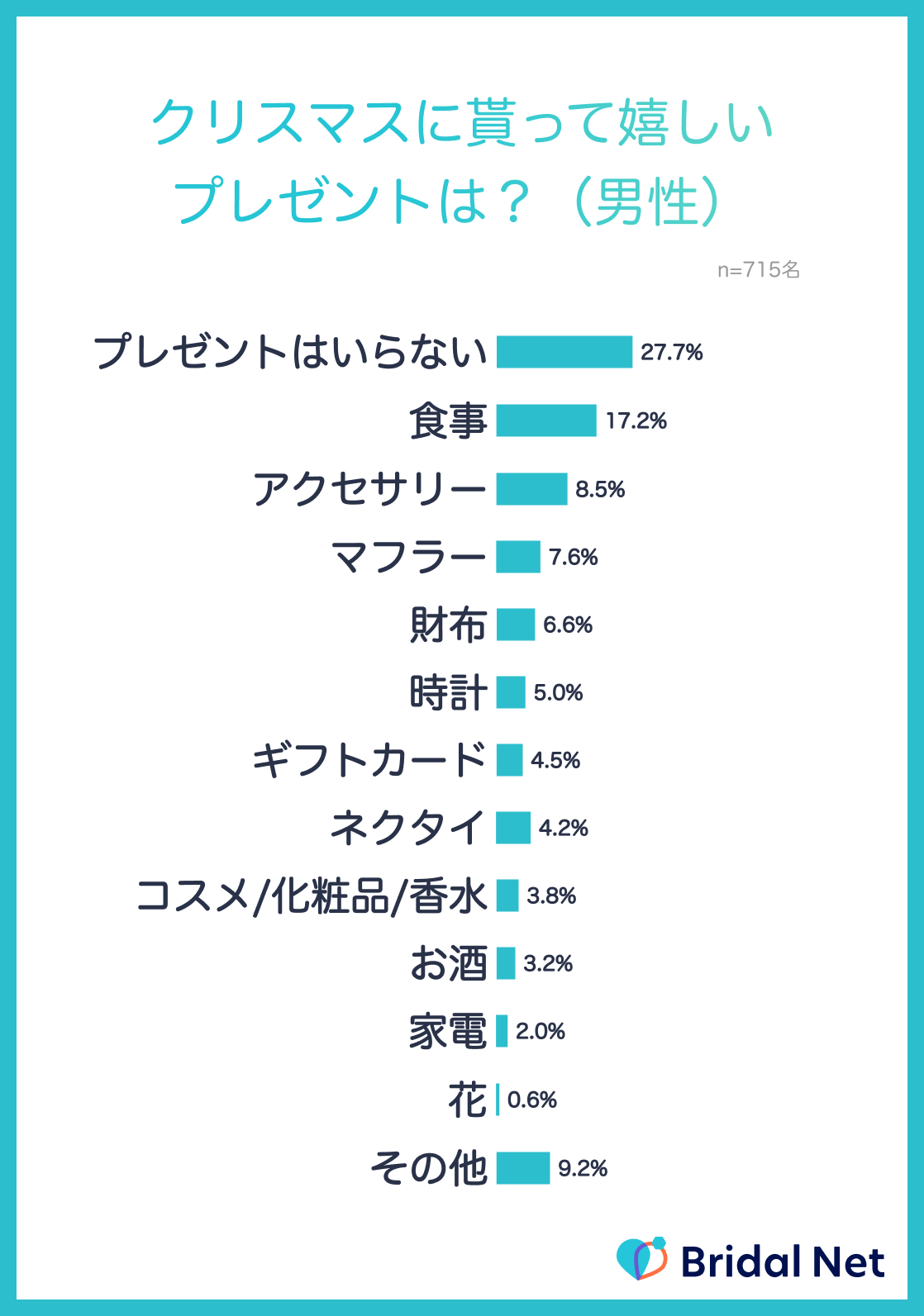 クリスマスに貰って嬉しいプレゼントについて質問したところ、男性は「プレゼントはいらいない(27.7%)」が最多という結果に。次いで2位が「食事(17.2%)」、3位が「アクセサリー(8.5%)」でした。